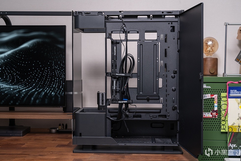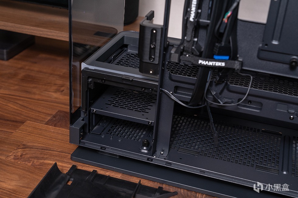 背部支架支持3个SSD安装,拆除底部左侧挡板后可取出硬盘支架,支持2个SSD和1个HDD或2个HDD的安装,灵活的存储组合满足用户海量数据存储的需求。底部右侧则是电源安装为,空间十分充裕,支持250mm的ATX电源。