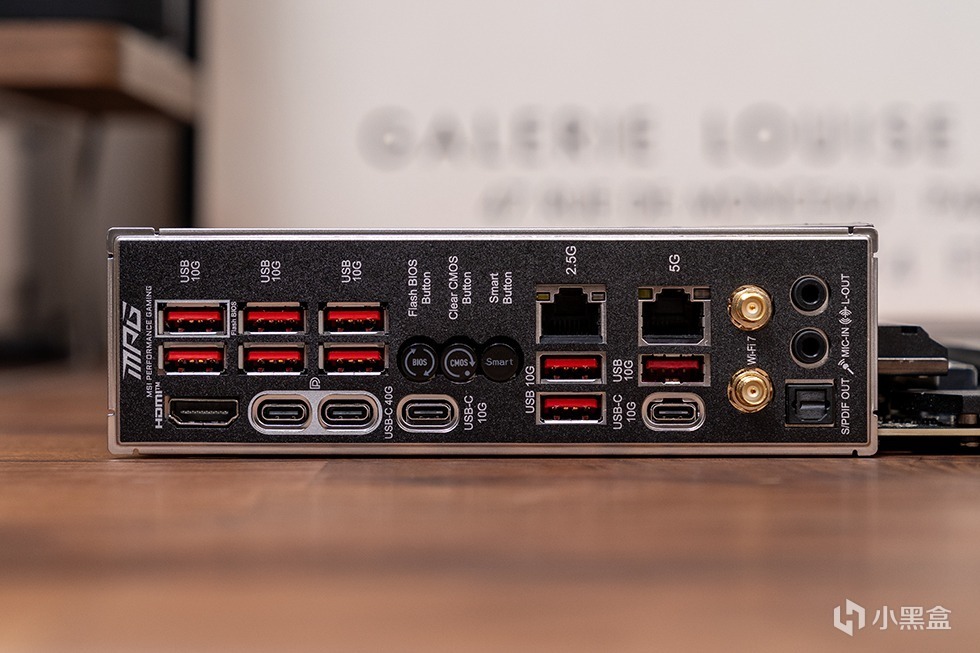 后置I/O区域采用了一体式I/O背板,提供了Clear CMOS按钮、Flash BIOS按钮、Smart Button按钮、HDMI 2.1、2*USB 40Gbps Type-C、2*USB Type-C 10Gbps、9*USB Type-A 10Gbps、5G和2.5G双网口、Wi-Fi 7天线接口以及带S/PDIF输出的音频接口。