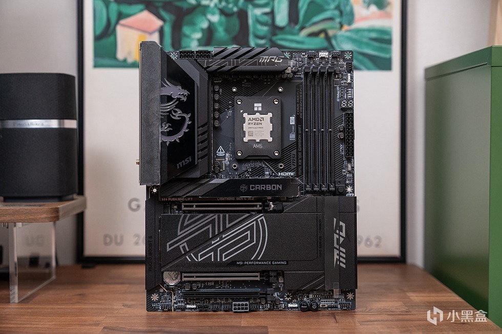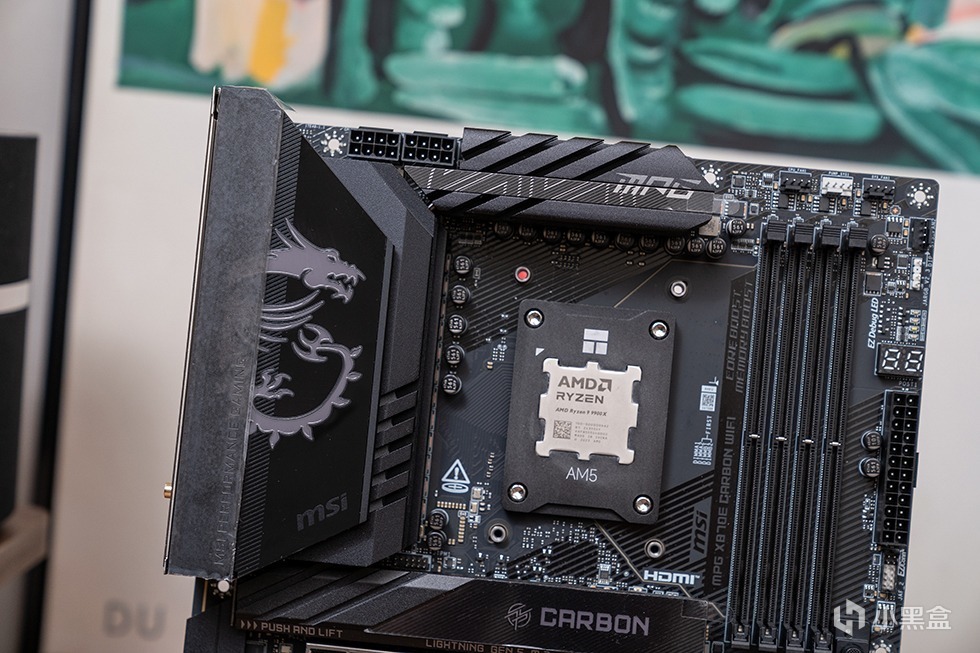 微星MPG X870E CARBON WIFI暗黑主板的VRM散热模组通过6mm热管连接,底部搭配7W/mK高系数导热垫。表面覆盖激光蚀刻龙纹图腾,支持Mystic Light RGB幻彩灯效(可通过MSI Center软件自定义)。采用18+2+1相数字供电设计,核心部分采用110A DrMOS,搭配第三代钛金电感与日系黑金电容,双8Pin CPU供电接口提供持续功率输出,可满足Ryzen 9 9950X3D旗舰超频需求。
