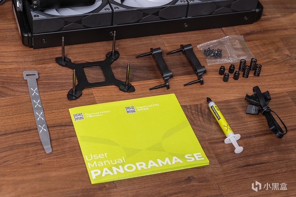 配件方面包含了INTEL和AMD扣具(兼容英特尔LGA1851/1700/1200/115X和AMD AM5/AM4平台),一条ARGB、灯光二合一延长线、魔术扎带和一支高性能α-01硅脂。