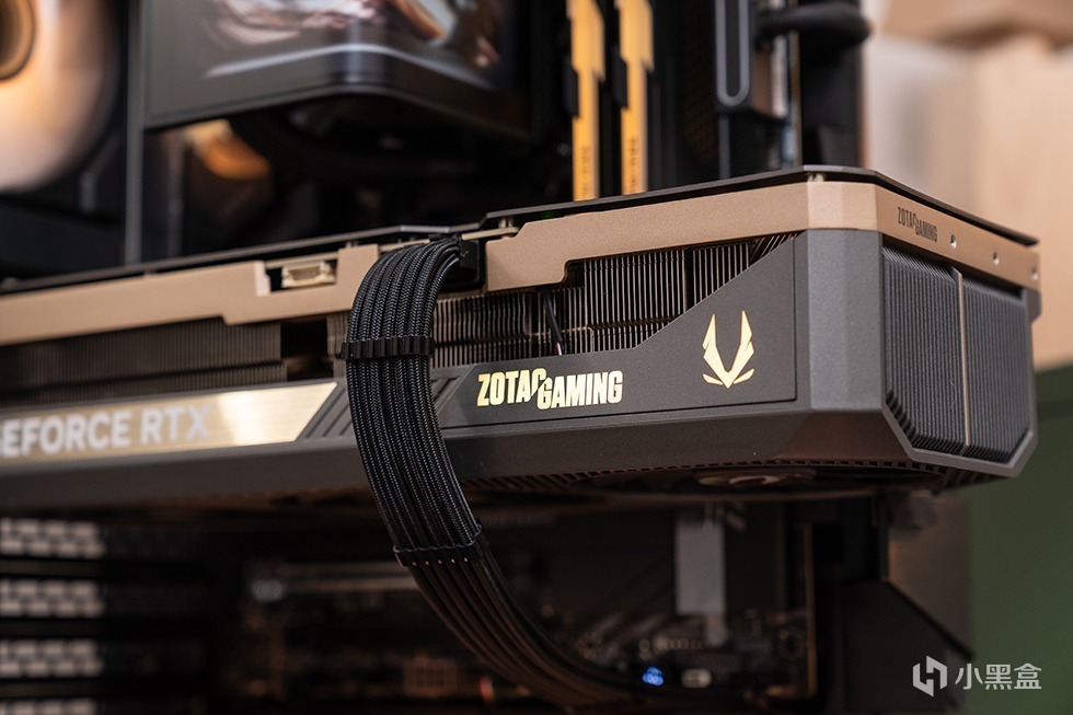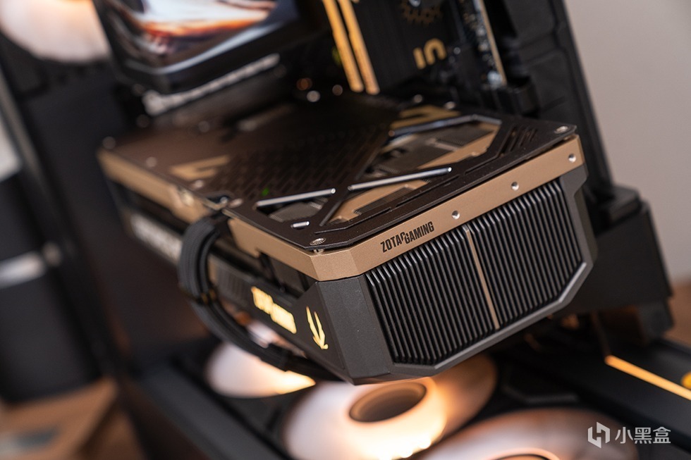 索泰GeForce RTX 5080 16GB SOLID OC显卡,体积为329.7mm x 137.8mm x 67.8mm,采用迭代升级的 ICESTORM 3.0 散热系统。贯穿式散热设计,使风扇风流可以垂直穿透鳍片,形成全方位立体散热风道。同时显卡的中框(PCB板上方的一圈香槟金色框体)使用高强度合金压铸成型工艺,具有超强的抗扭、抗压能力,防止显卡变形,提升显卡整体结构强度。