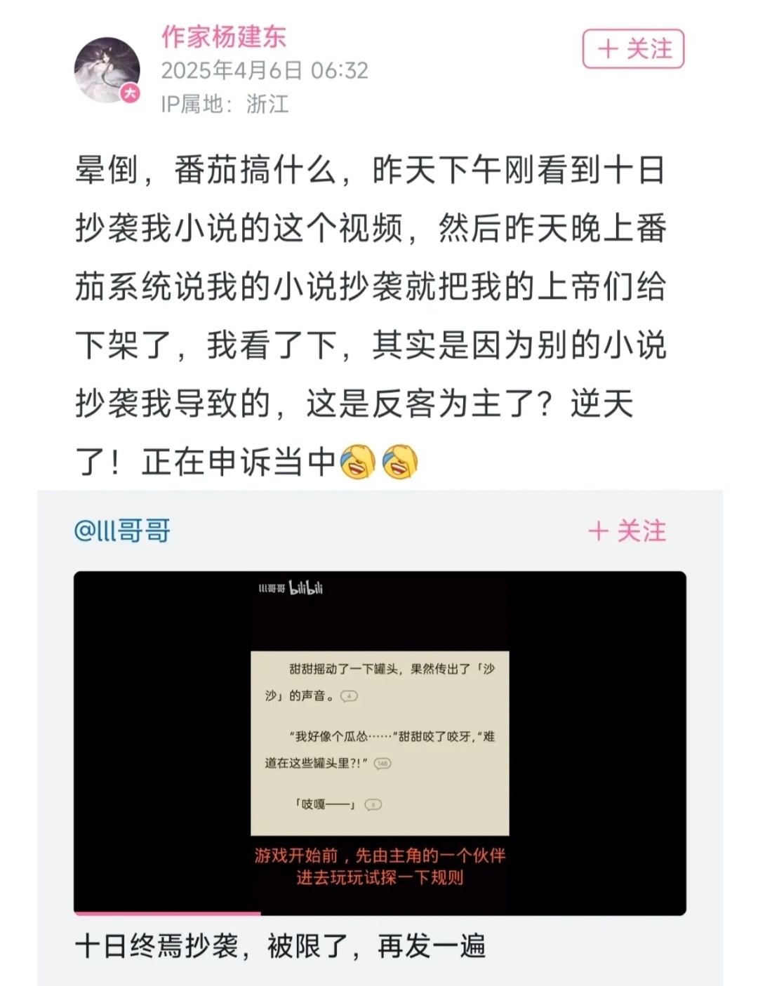 昨天,作家楊建東公開質疑番茄小說頭部作品《十日終焉》和自己之前的作品很像。