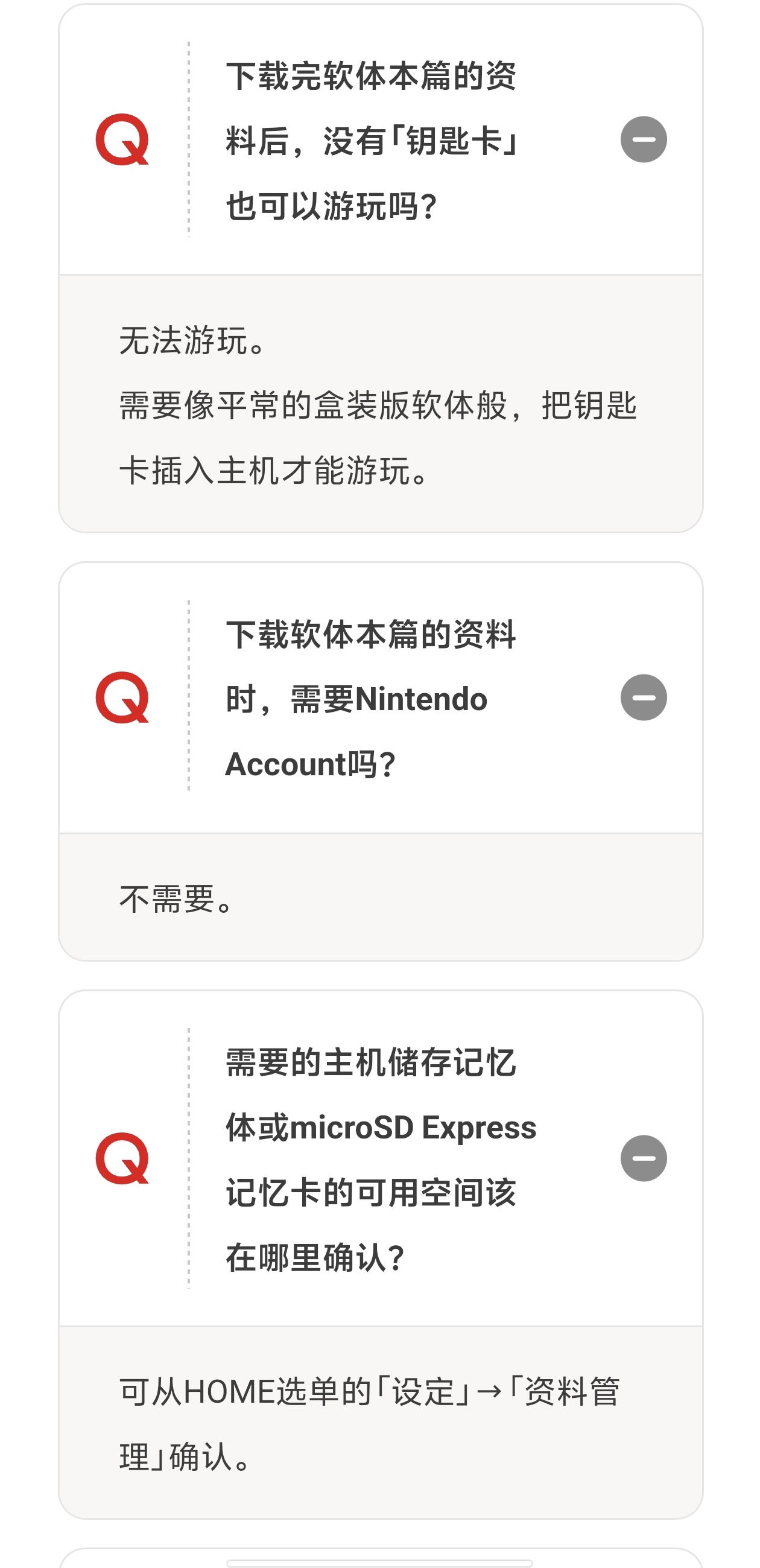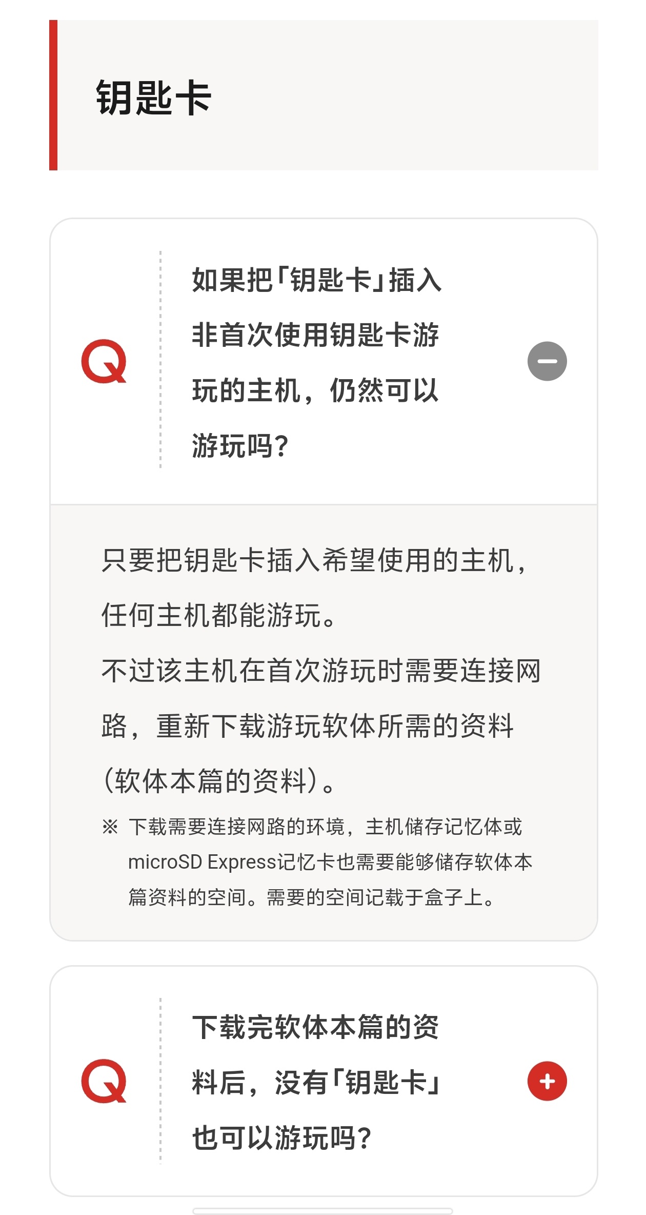 根據任天堂官方更新的說明,也詳細確認“鑰匙卡”在首次插入Switch 2 主機後,需要連接網絡,下載完整的遊戲文件到主機的存儲空間或是microSD Express存儲卡內。雖然和數字版不同,玩家不需要登錄Nintendo Account賬號,但遊玩時卻需要像普通實體卡一樣,保持插入的狀態才能遊玩,遊戲文件則是和其他遊戲一樣,存在主機空間裏面。凡是使用“鑰匙卡”的實體版,封面上也會有相關標誌。