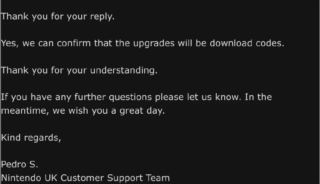 而英国任天堂客服在回应相关问题时,给出的说法则是:升级包是下载码。