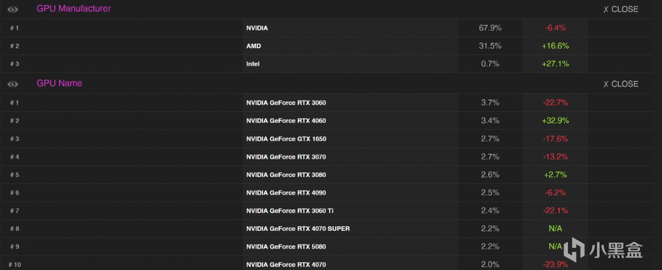 具體型號榜單呈現戲劇性局面:RTX 3060以5.8%佔比蟬聯冠軍,RTX 4060以0.3%微弱差距緊隨其後,上市多年的GTX 1650仍以2.7%佔比位列第三。新一代顯卡中僅RTX 5080以2.2%佔比躋身第八,顯現出用戶升級意願的保守態勢。