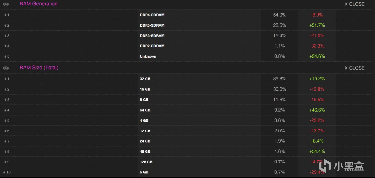 內存容量方面,32GB配置自2024年起持續攀升,現已超越16GB成爲主流選擇。從內存代際來看,DDR4仍佔據55.3%的市場份額,但DDR5正以驚人速度普及,4月份增速高達51.7%,整體市佔已達28.6%。