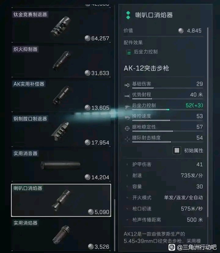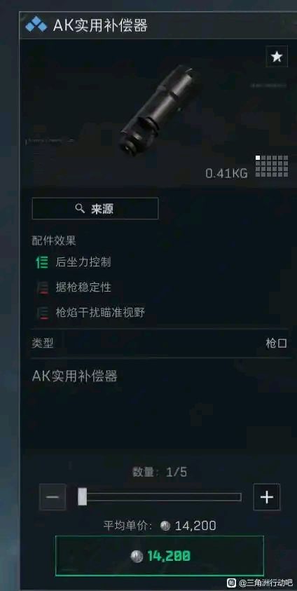 ak槍族專用的槍口,五千的價格相當實惠而且能加3點後坐力的同時沒有任何負面效果。鼠鼠改爛仔流ak系列武器時推薦用這款槍口, 便宜好用的同時還可以讓你的敵人打死你後也撿不到多少可以裝在搶上帶出去賣的配件。
