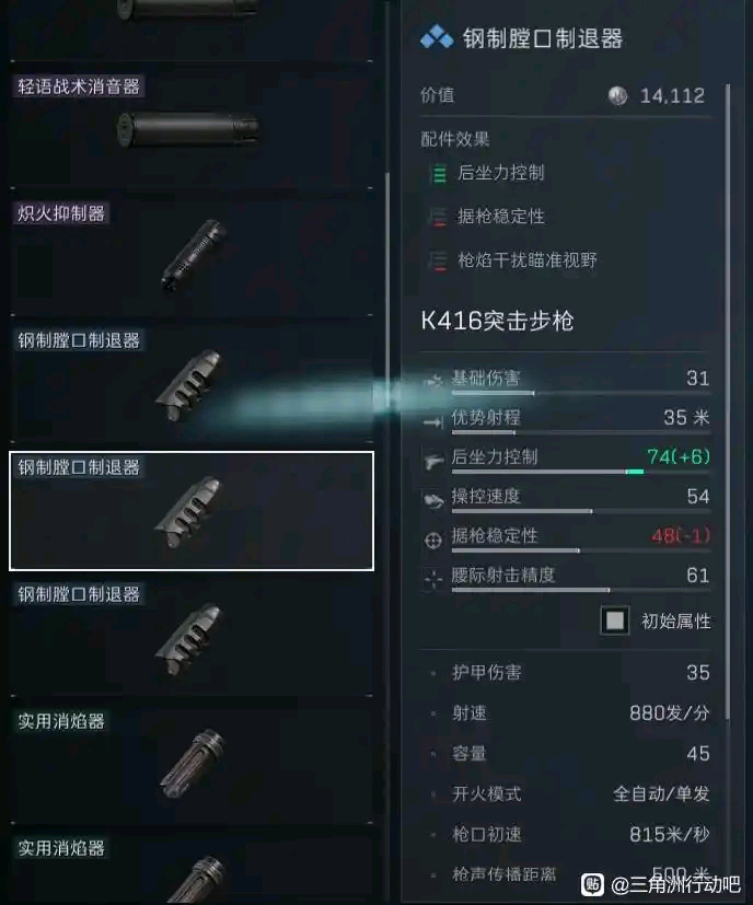 性價比很高比較實用的槍口,優點是價格低而且給的屬性很高,在軍需處只需要花1w左右就可以兌換一個戰備價值1w4k的槍口。不過缺點也比較明顯#(陰險) 在加裝了這個槍口後的槍口火焰大的誇張很容易導致激烈對槍時看不清目標導致馬槍,並且這個版本在加強了據槍穩定性的價值後就讓這個還會降低據槍穩定性的槍口評分進一步降低。不過相較於其他價格動輒3w起步的高級槍口來說他的性價比目前還是無可代替的。