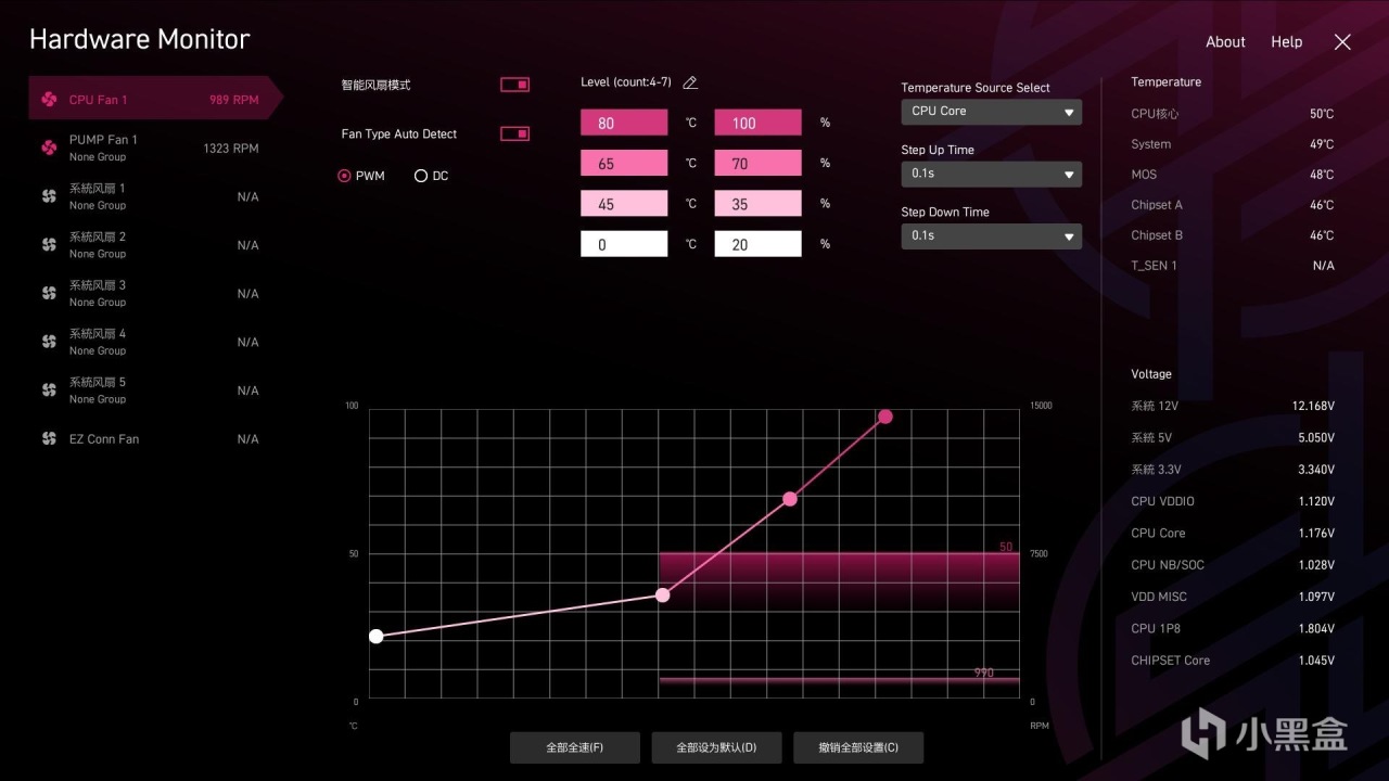 Hardware Monitor可實時監控硬件參數,查看CPU/內存電壓、溫度及風扇轉速,並支持自定義風扇曲線。我們可以參考CPU核心溫度、系統溫度、MOS管溫度、PCH芯片組溫度以及CPU底座等信息設置風扇轉速(以CPU核心溫度爲主)。
