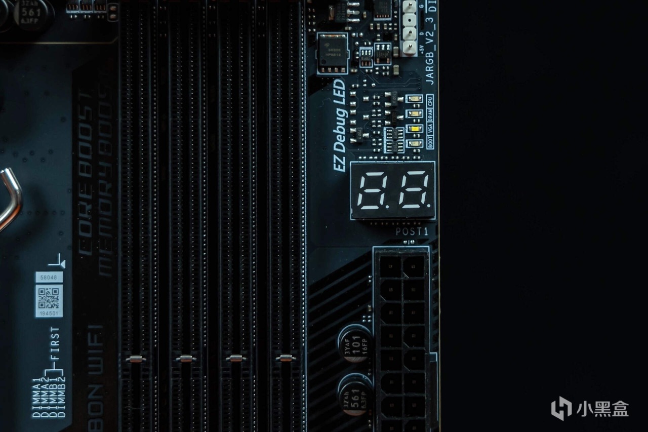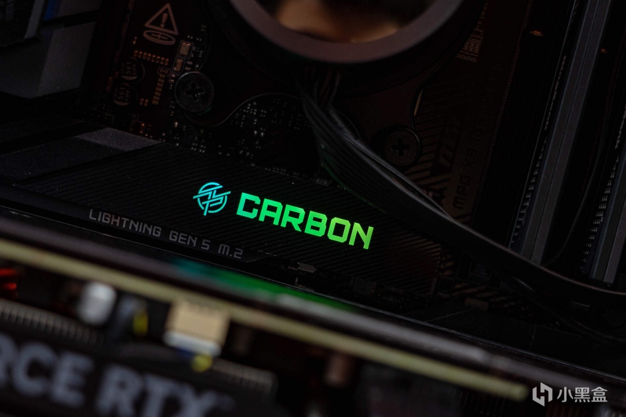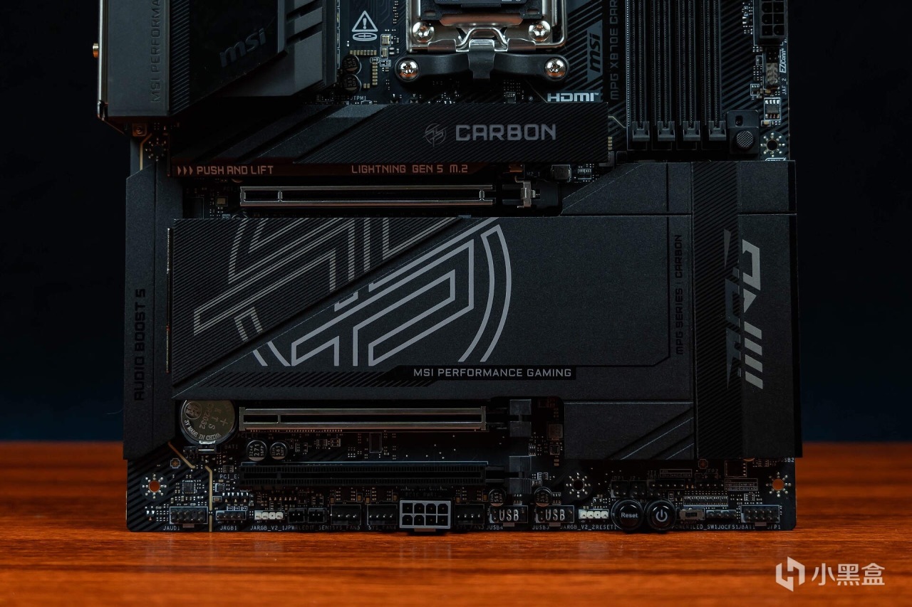最上方M2_1接口單獨配備了M.2加厚散熱裝甲,保障SSD高速、穩定運行,裝甲表面的“CARBON”字樣支持RGB燈效。