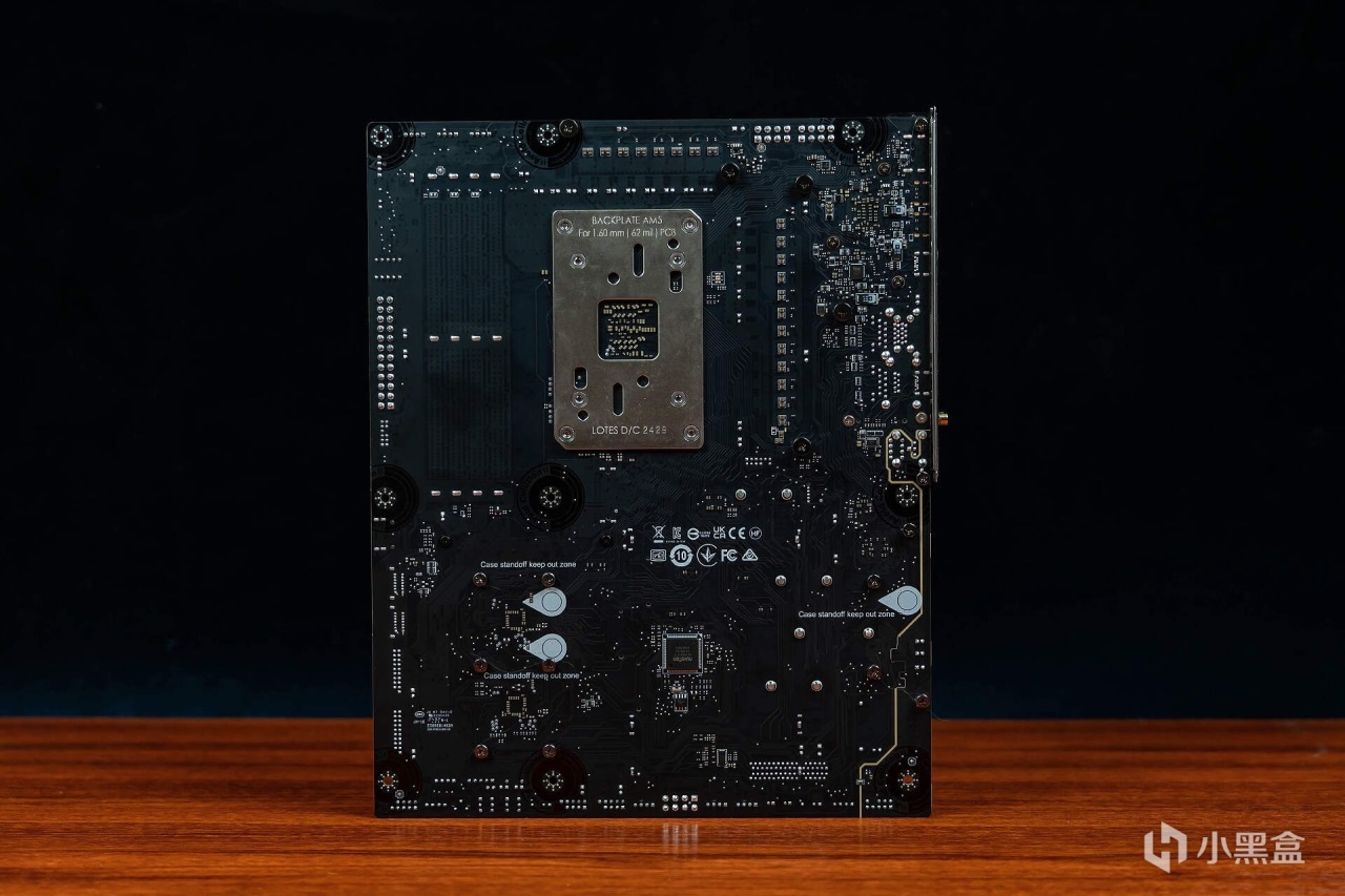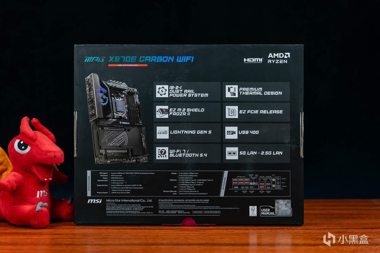 正面着重強調了主板的外觀、型號,支持AMD 9000系列處理器、WiFi 7、40Gbps高速Type-C接口等信息。左下角有一張安全警示標籤(印在盒子上的,不是貼紙),大概意思是提醒消費者本產品含有CR2032紐扣電池,要放在兒童接觸不到的地方,一旦發生誤食、燒傷等意外情況都要立即就醫,雖然視覺上有點格格不入,但安全防範意識值得所有品牌學習。