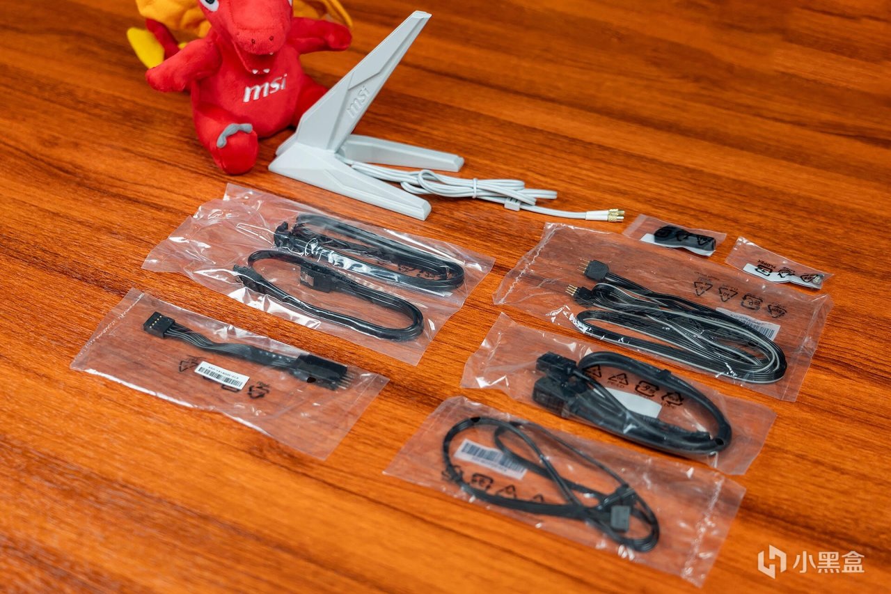 主板的配件非常豐富,除了紙質說明書和貼紙以外,還包含:機箱前置跳線延長線、12V RGB一分二轉接線、5V ARGB轉接線、微星三合一擴展線(連接水冷的ARGB 燈、系統風扇和USB裝置)、SATA線*2、Wi-Fi 7鯊魚鰭天線、驅動U盤、鑰匙造型的螺絲拆裝工具等。