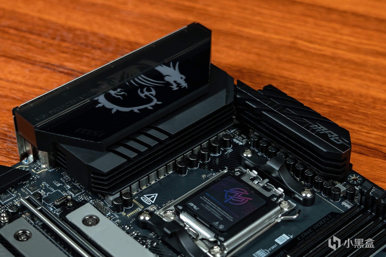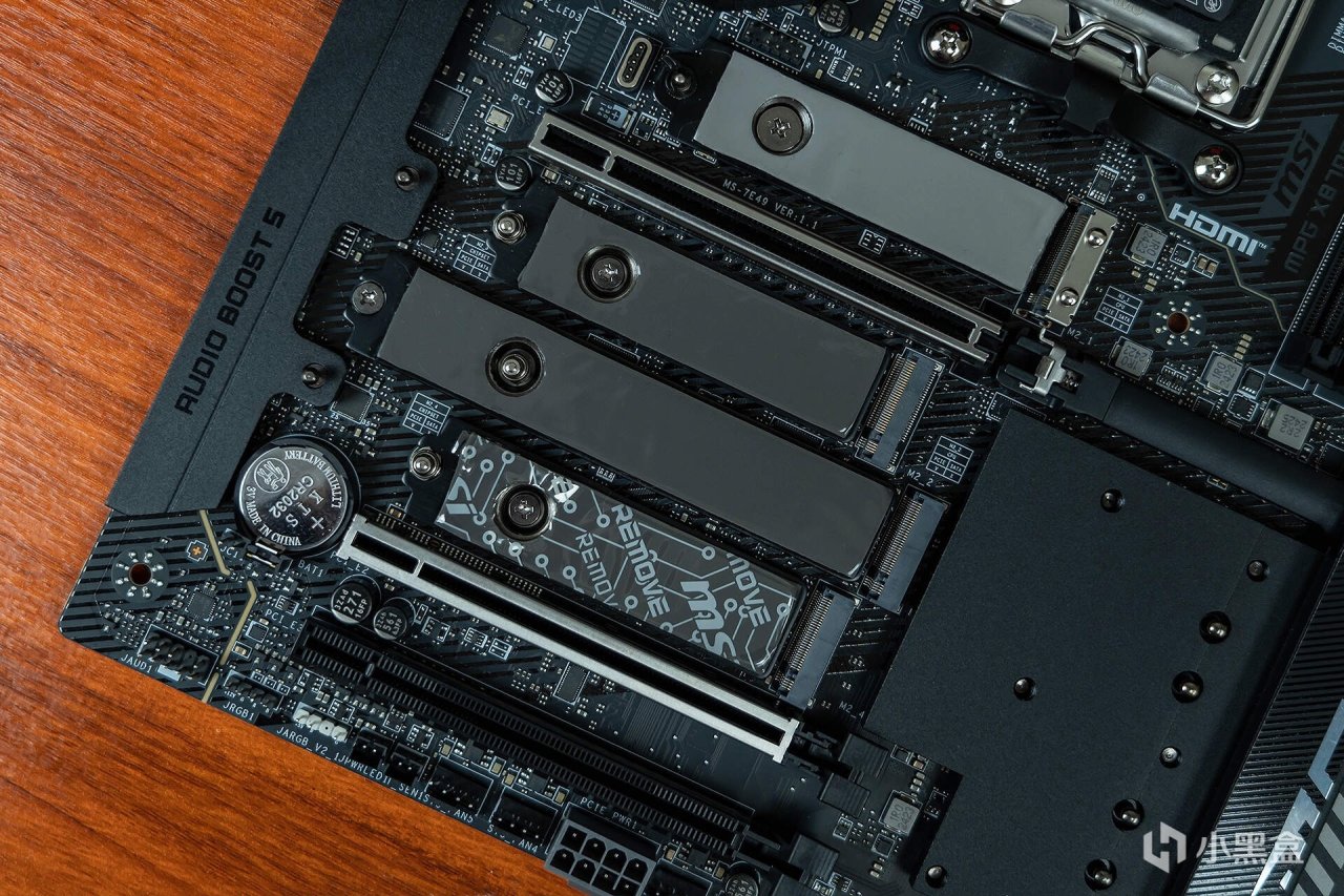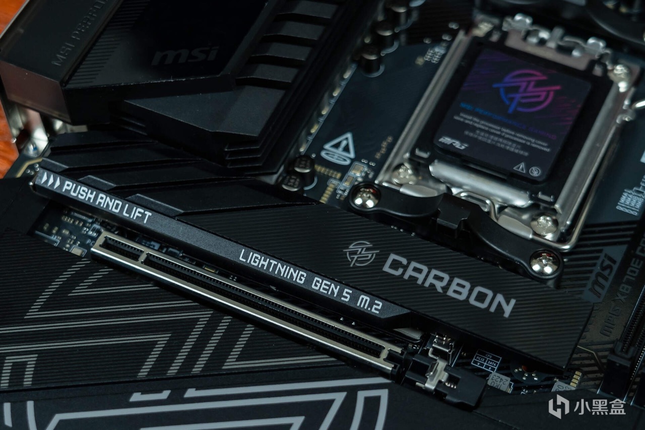 下方是同樣做了加大處理的M.2散熱裝甲,表面爲碳纖維紋理和磨砂紋理拼接設計,質感很棒,不僅能增大散熱面積,還爲用戶呈現層次分明的視覺立體感。M.2散熱裝甲+槽位各有一片散熱墊,把M.2 SSD夾在中間,確保其讀寫性能不會因溫度過高而降速。