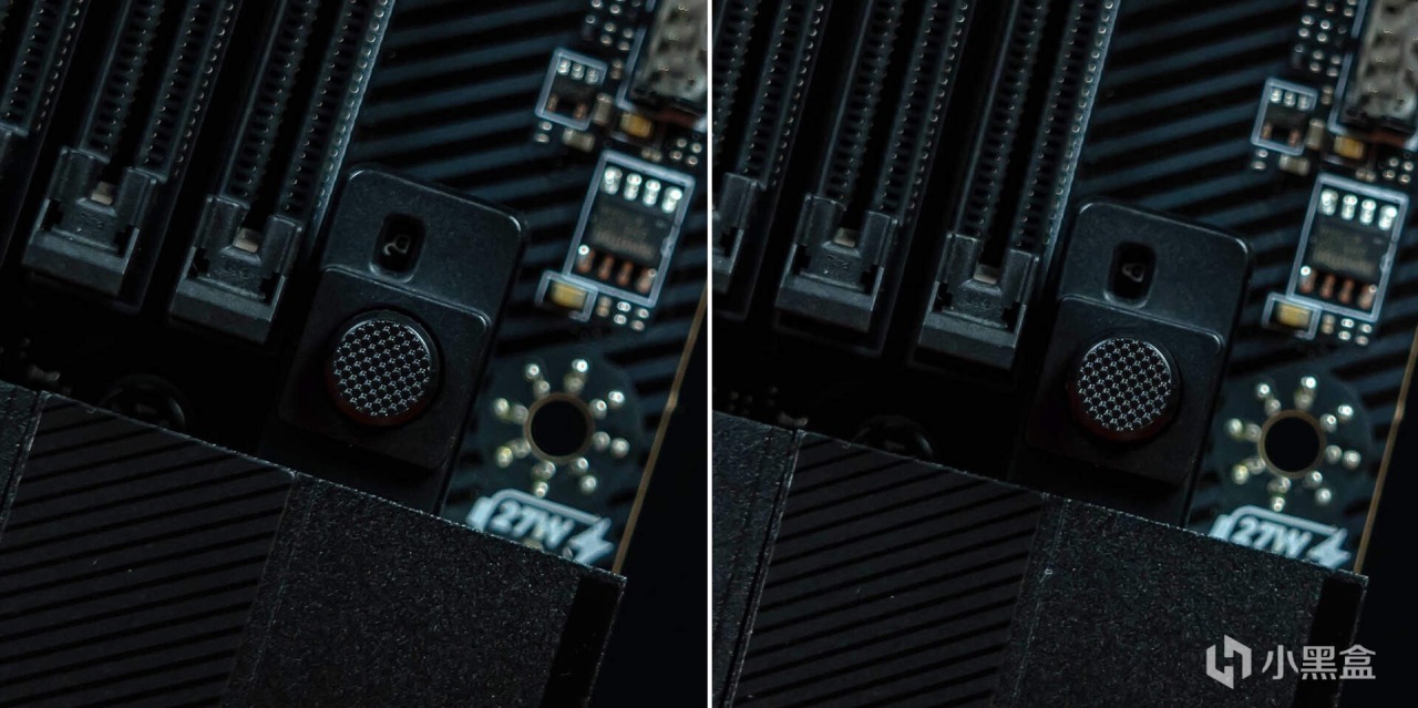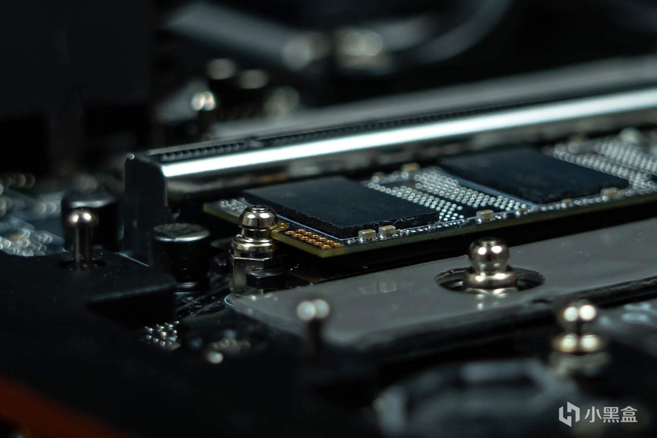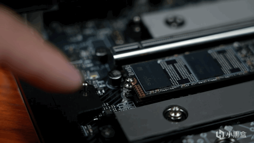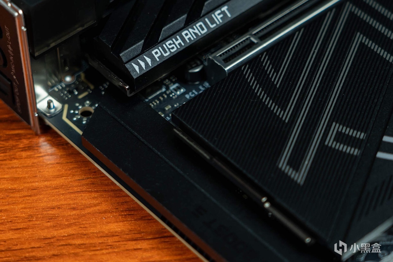 下方是同樣做了加大處理的M.2散熱裝甲,表面爲碳纖維紋理和磨砂紋理拼接設計,質感很棒,不僅能增大散熱面積,還爲用戶呈現層次分明的視覺立體感。M.2散熱裝甲+槽位各有一片散熱墊,把M.2 SSD夾在中間,確保其讀寫性能不會因溫度過高而降速。
