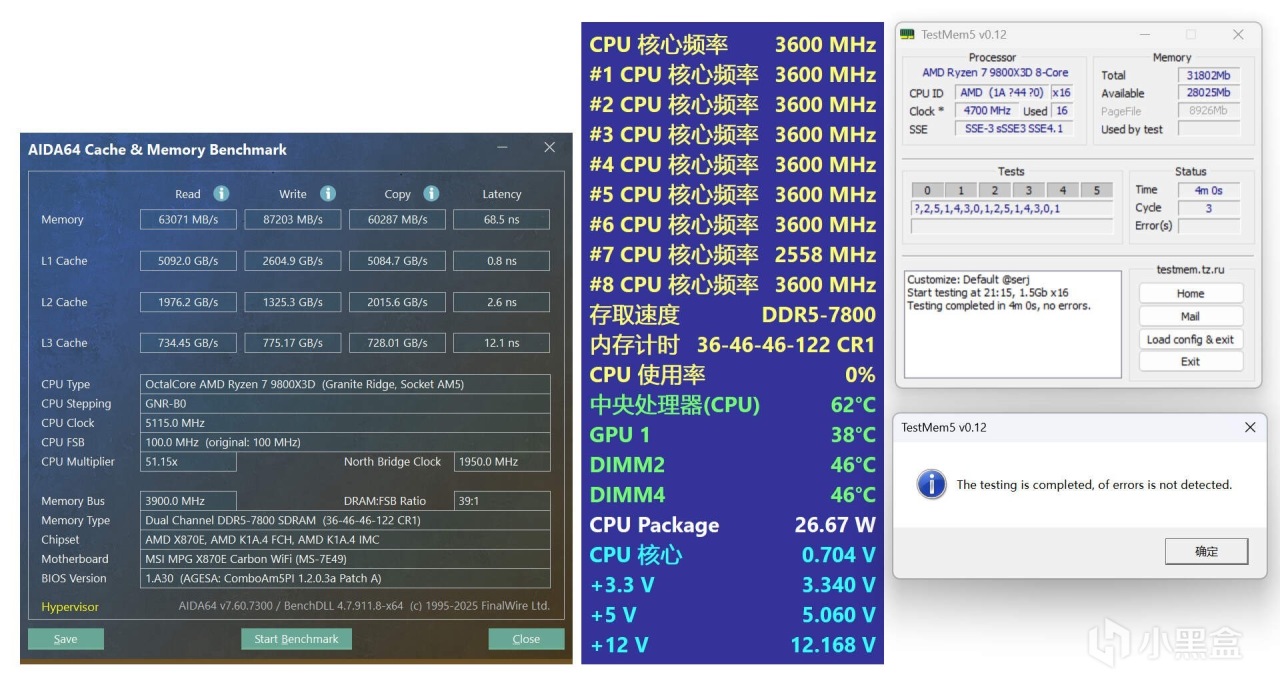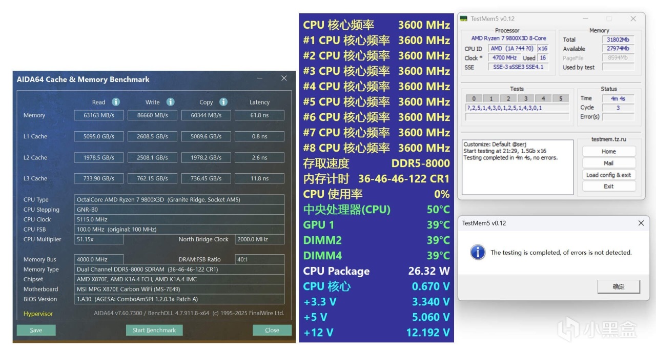 通過Memory Try It,我嘗試超頻至7200-7400-7600-7800-8000,本以爲會遇到各種卡頓、藍屏問題,沒想到一路綠燈,而且全部0報錯穩過TM5壓力測試。不愧是特挑海力士A-Die顆粒,金百達星刃的超頻潛力太給力了。不過,在內存超頻到8000MHz時,性能提升變得微乎其微,寫入性能甚至出現倒退情況,所以決定停止在了8000MHz。