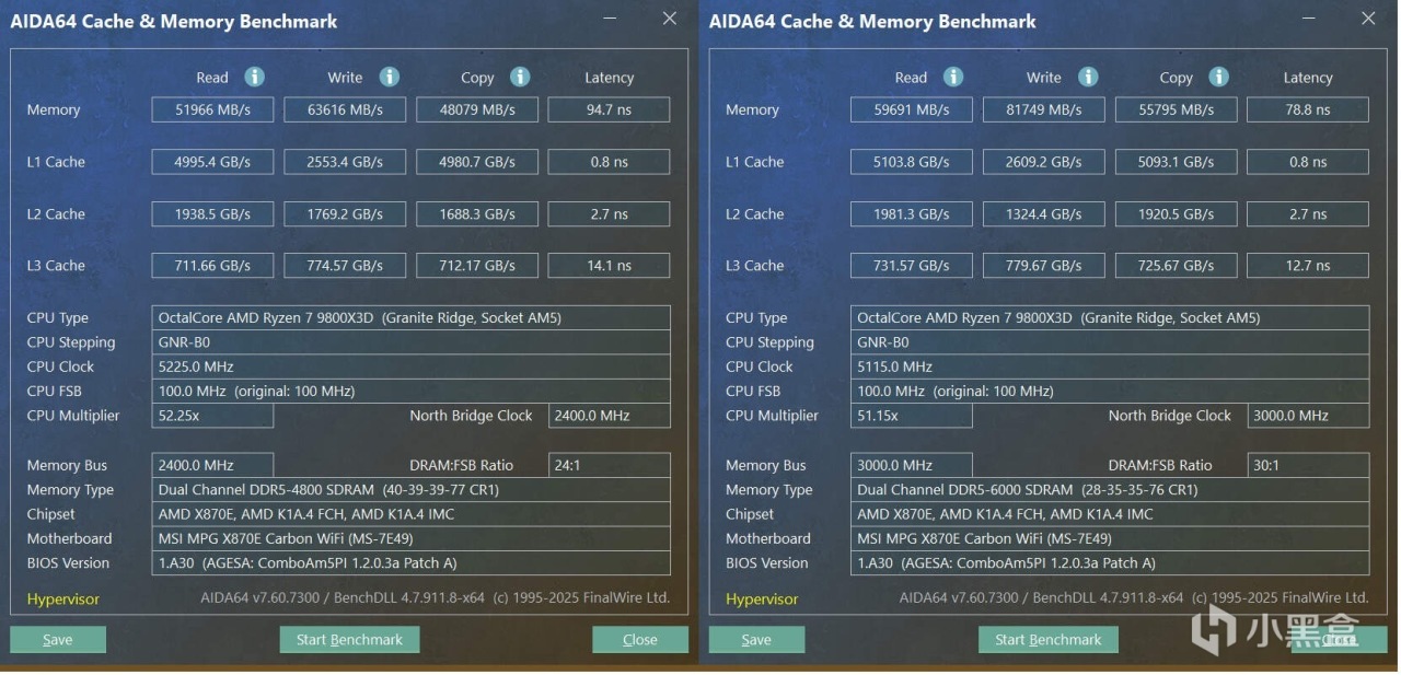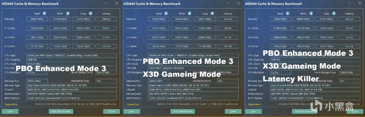 開啓PBO Enhanced Mode 3,讀取速度爲59691 MB/s,寫入速度爲81749 MB/s,拷貝速度爲55795 MB/s,延遲爲78.8 ns;在此基礎上,開啓X3D Gameing Mode,讀取速度爲63875 MB/s,寫入速度爲88440 MB/s,拷貝速度爲58877 MB/s,分別提升了約7%、8.2%、14.5%,延遲爲70.2 ns,減少約11%。