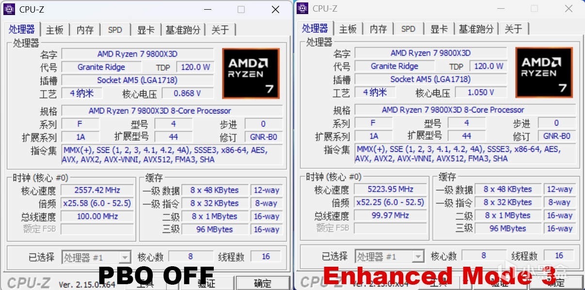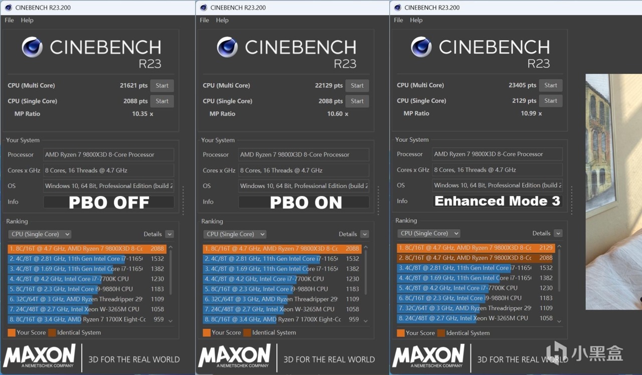 在9800X3D的Cinebench R23測試中,PBO開啓默認模式多核性能比關閉時提升約2.3%,單核性能沒有變化,MP Ratio提升約2.4%;開啓PBO Enhanced Mode 3後多核性能比默認開啓模式提升約5.8%,單核性能提升約2%,MP Ratio提升約3.7%,比PBO關閉時分別提升約8.3%、2.3%和6.2%。
