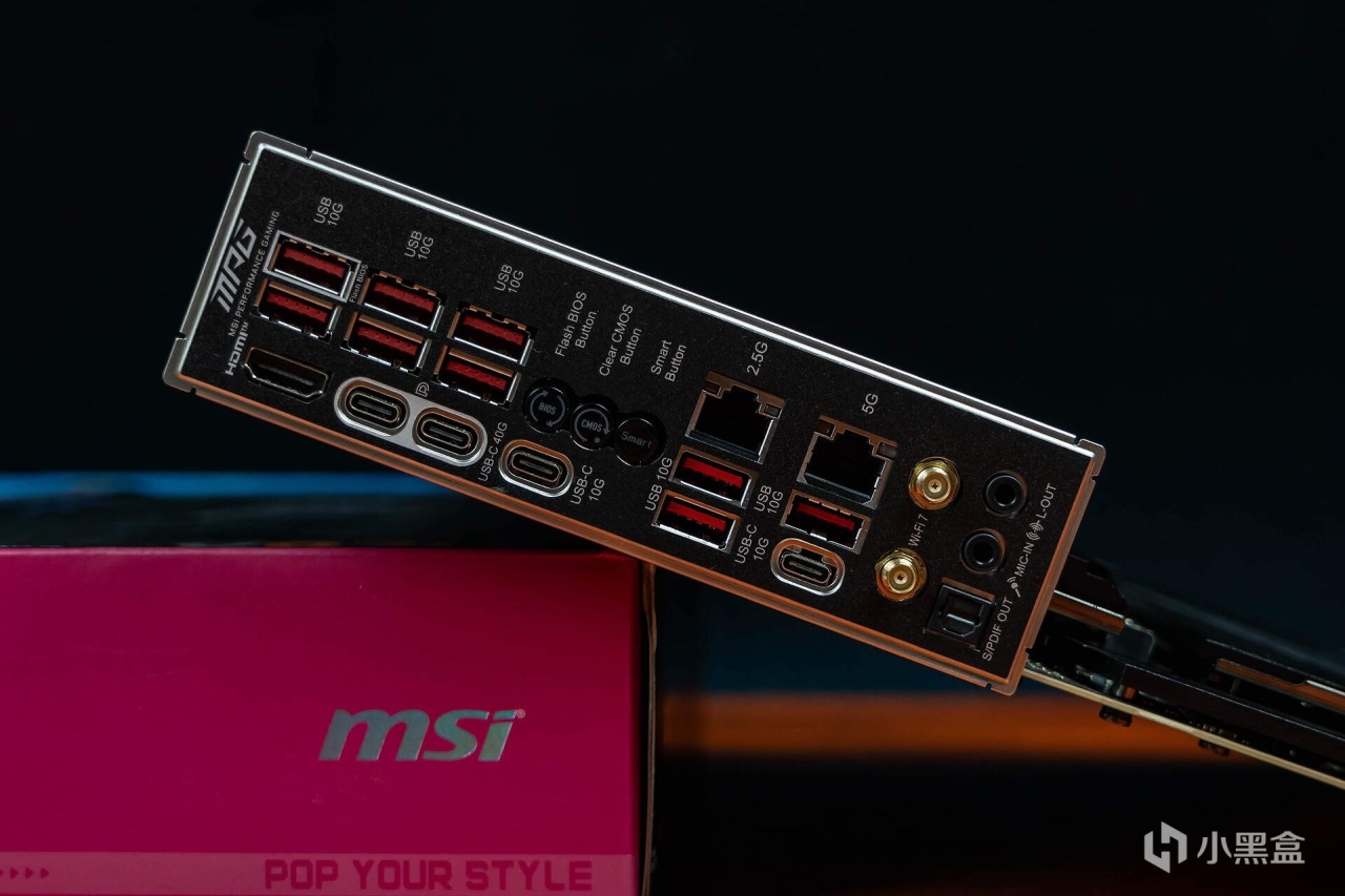 微星 MPG X870E CARBON WIFI暗黑主板的I/O接口取消了USB 3.2Gen1 5Gbps接口,直接給了9個USB 3.2Gen2 10Gbps接口,以及2個雷電4 40Gbps接口、2個USB-C 10Gbps接口、1個HDMI 2.1接口(最高支持8K@60Hz)、1個5G網口、1個2.5G網口、Wi-Fi 7天線接口、3.5mm音頻接口和1個數字光纖音頻接口。除此之外,還有1枚BIOS更新鍵、1枚BIOS清除設置鍵和1枚BIOS自定義智能鍵。這套接口堪稱豪華!