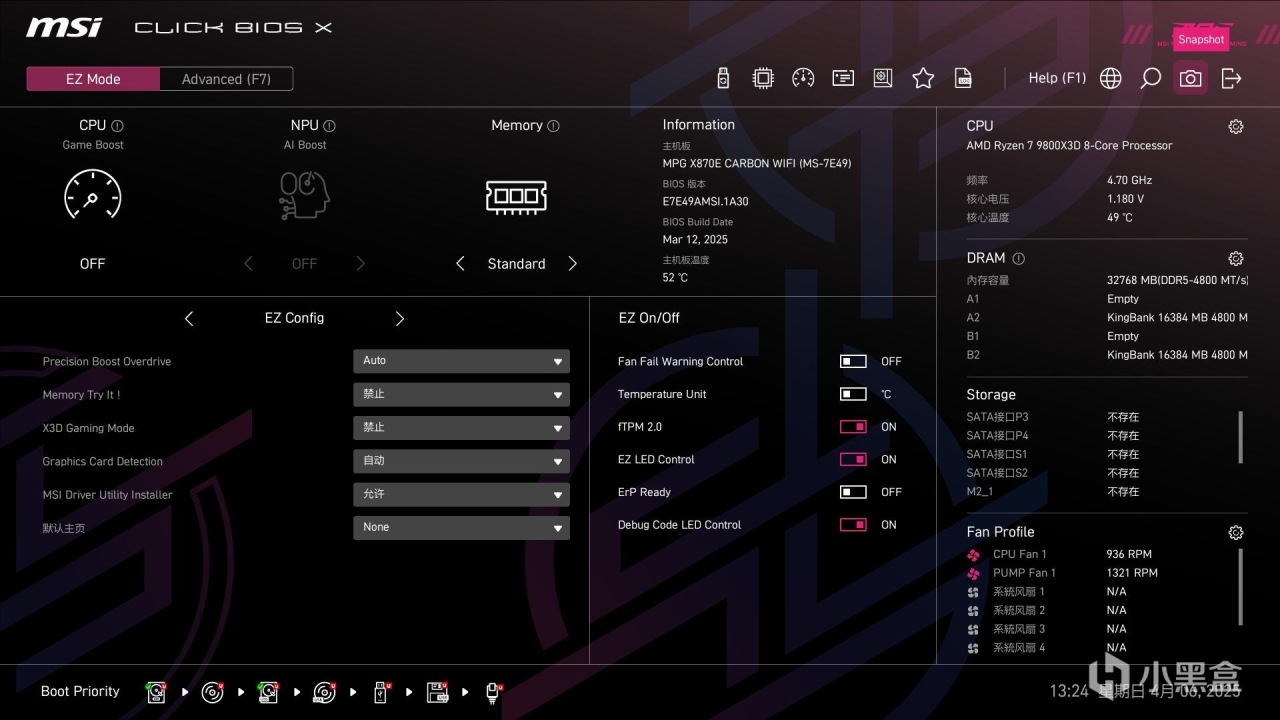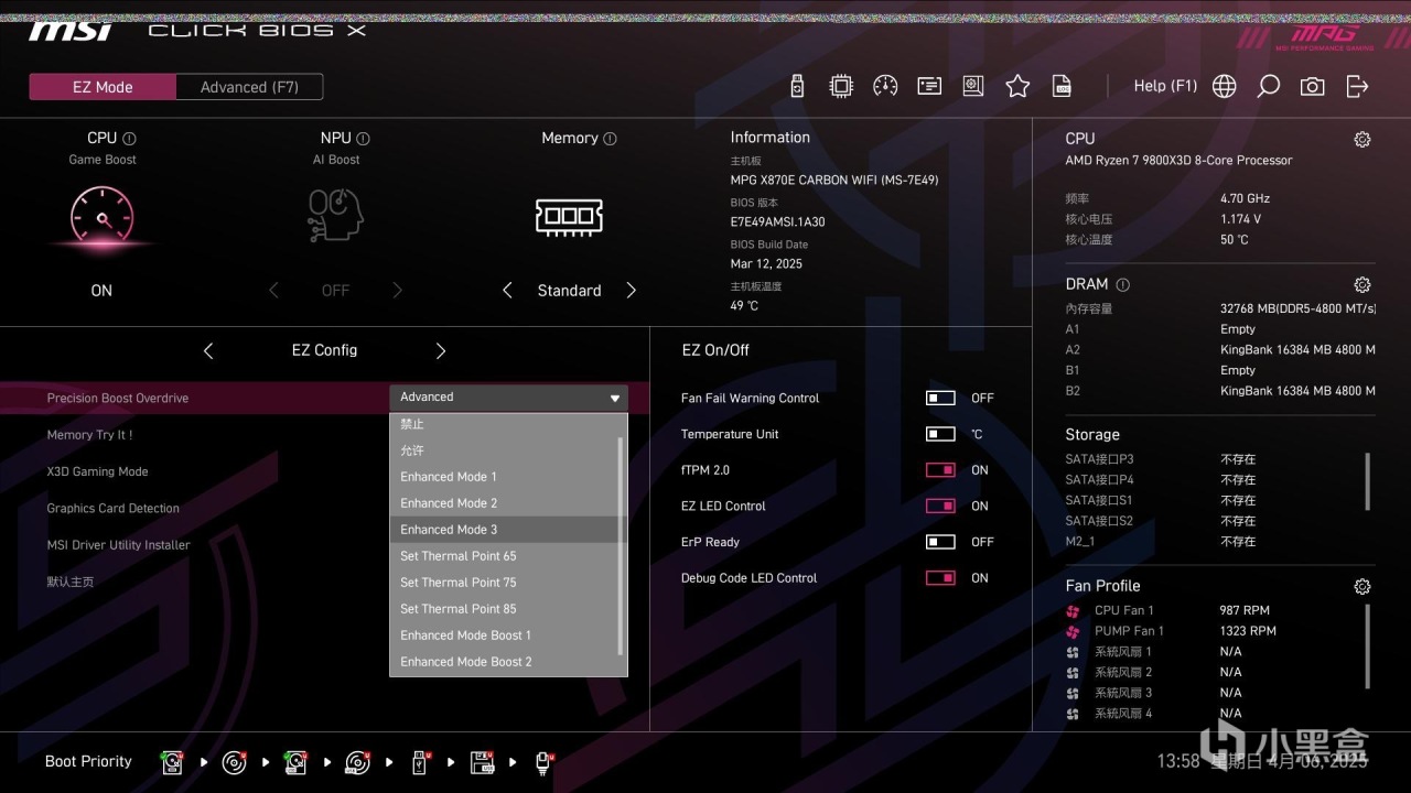EZ Mode的可調選項越來越豐富,上半區集成了CPU Game Boost一鍵CPU超頻、NPU AI Boost一鍵NPU加速、Memory一鍵內存超頻三大功能,無需深入子菜單即可快速調整核心設置,適合新手和小白用戶。