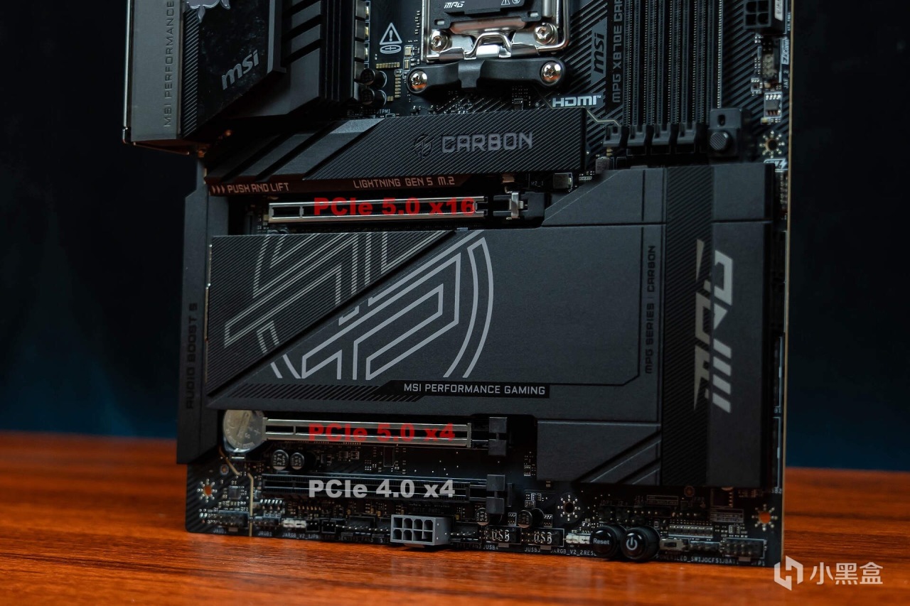 微星 MPG X870E CARBON WIFI暗黑主板共有3個全尺寸PCIe插槽,第一槽爲PCIe 5.0 x16滿速通道(直連CPU),第二槽爲PCIe 5.0 x4通道(直連CPU),這兩個插槽均配備第二代鋼鐵裝甲,第三個插槽爲PCIe 4.0x4通道(芯片組)。