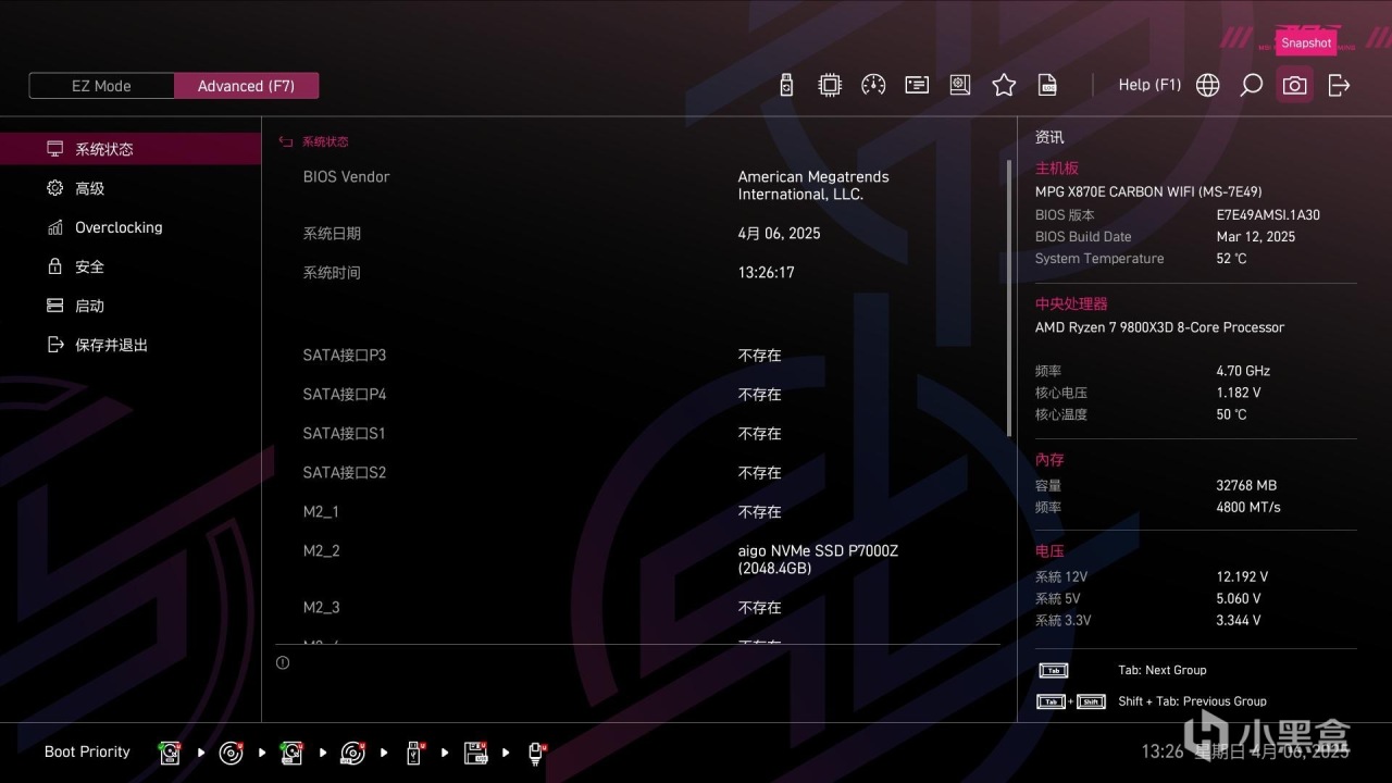 文章開始時我曾提過,微星 MPG X870E CARBON WIFI暗黑主板的新版BIOS,是我用過所有主板裏調控最順手的BIOS之一,這話並不是誇大其詞。全新設計的BIOS界面簡潔、直觀,EZ Mode(簡易模式)和Advanced(高級模式)兩套操作界面,提供更美觀、更友善的使用體驗,讓玩家可以更快速存取和調整系統配置。BIOS界面的水紅色描邊與包裝盒上的顏色遙相呼應,細節到位。