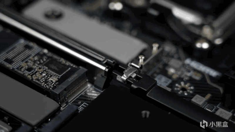 4個M.2 SSD槽位中,第1槽是手動固定栓,需手動撥動, 2/3/4槽位的M.2 SSD固定螺絲升級爲EZ快拆設計,輕輕按壓SSD即可鎖死,反向撥動金屬圓頭可一鍵解鎖,單手操作更便捷,顯著提升安裝效率。