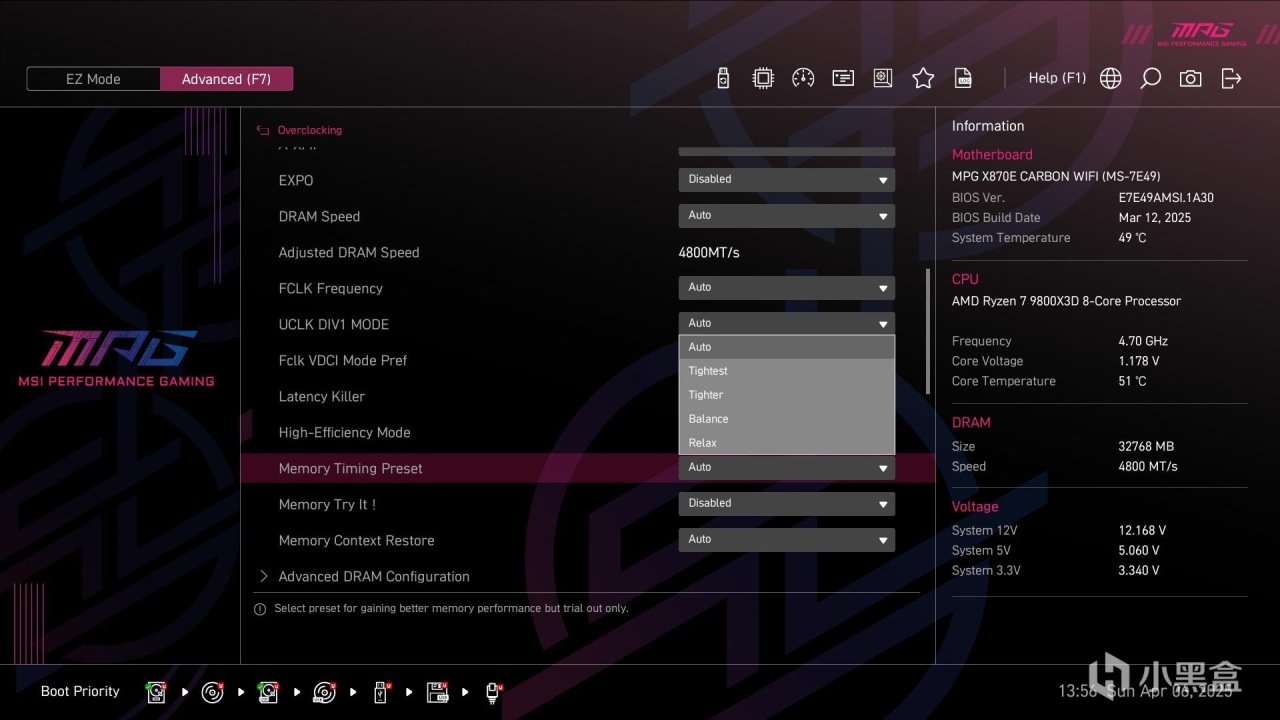 除了EXPO一鍵超頻功能外,微星 MPG X870E CARBON WIFI暗黑主板的BIOS裏開啓Memory Try It功能,內置超多經過針對性預優化的超頻方案,每檔頻率又分出多個不同的小參方案供用戶測試,無需手動調整內存頻率、電壓和時序等小參數即可輕鬆提高DDR 5內存性能,簡單、粗暴、又實用,是超頻小白的福音。當然,如果你有一定技術基礎,也可以在預設的基礎上微調小參,達到更完美的超頻效果。
