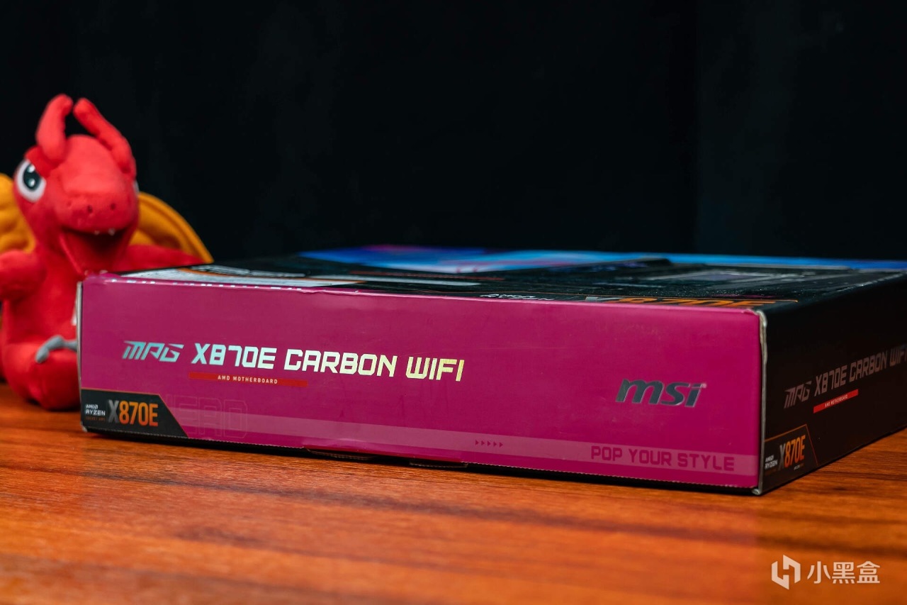 微星 MPG X870E CARBON WIFI暗黑主板的包裝設計相比上代X670E(以簡約風格爲主)有了創新性改變,黑色主基調+賽博配色背景,呈現的產品信息更豐富,畫面越來越飽滿,突出了科技感和電競主題。