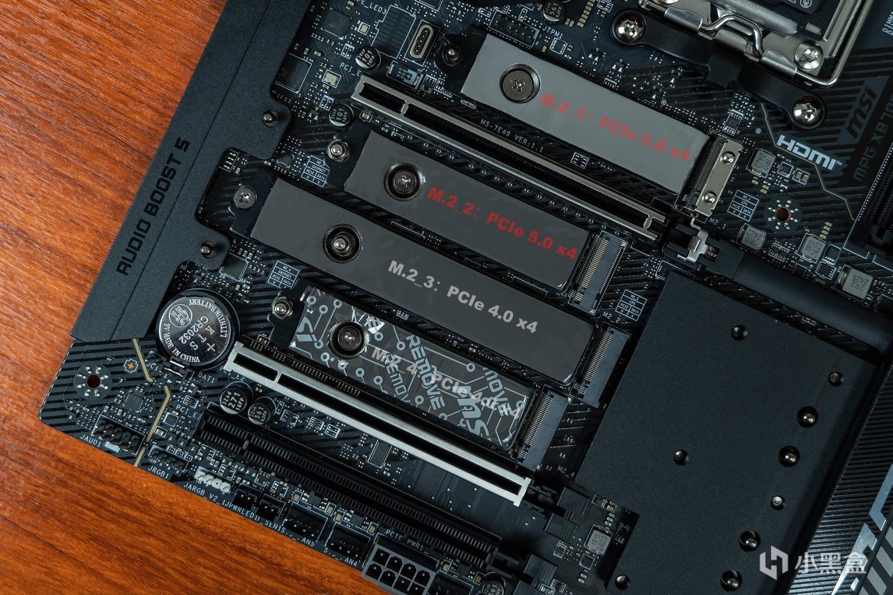 拆下兩塊散熱裝甲,我們可以看到微星 MPG X870E CARBON WIFI暗黑主板配備了4條PCIe M.2 SSD接口,M.2_1與M.2_2爲直連CPU的PCIe 5.0 x4通道,支持2280/2260設備;M.2_3與M.2_4爲連接芯片組的PCIe 4.0 x4通道,M.2_3支持22110/2280設備,M.2_4支持2280/2260設備。
