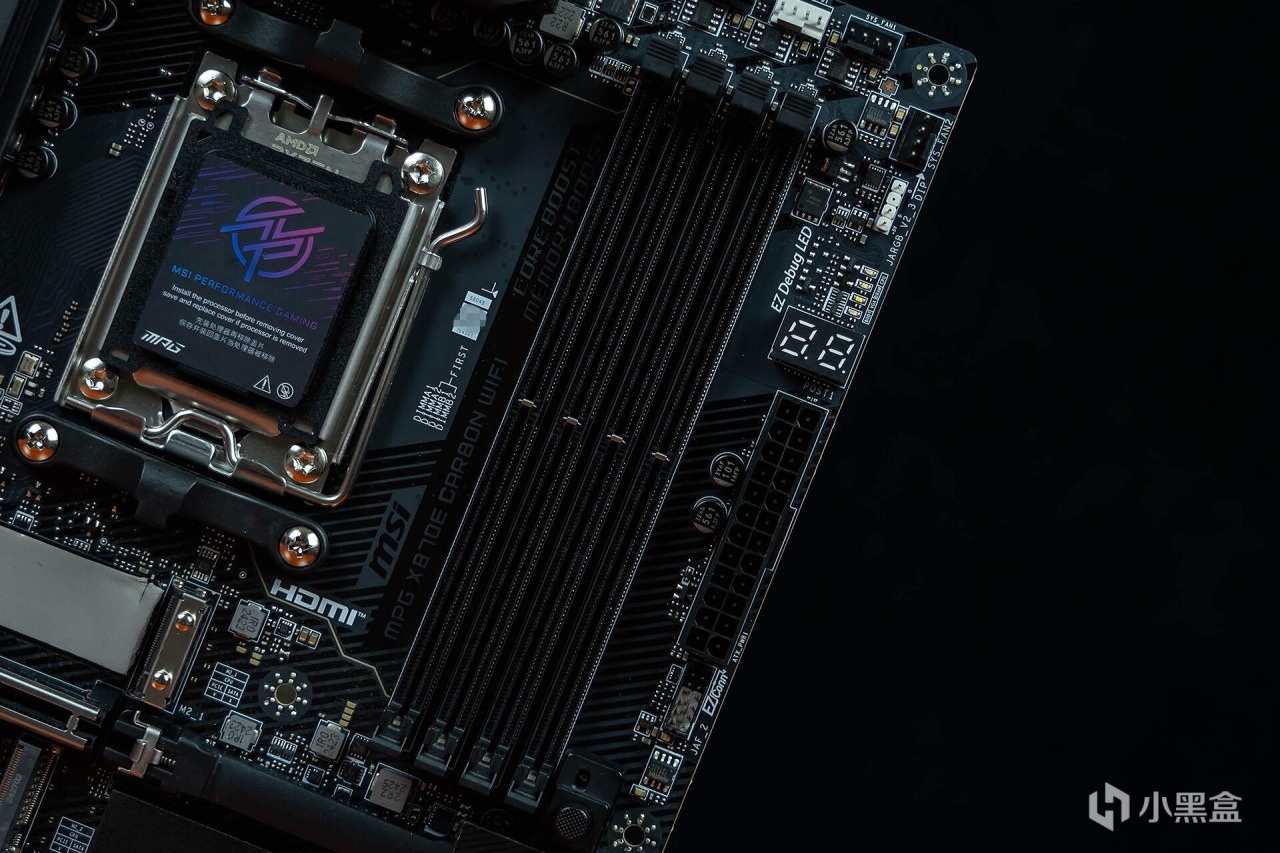 這一代X870E/X870系主板有三大核心升級:全系標配USB 4接口、原生支持PCIe 5.0顯卡和M.2 SSD插槽、EXPO內存超頻性能有顯著提升,是9800X3D的最優選。所以,主板我選擇了微星 MPG X870E CARBON WIFI暗黑主板,搭載旗艦級規格的18+2+1相110A DrMOS供電系統,內存支持雙通道DDR5 8400+超頻頻率,裝備服務器級8層PCB和加強型散熱裝甲,確保9800X3D在高負載遊戲或多線程任務中的穩定輸出。