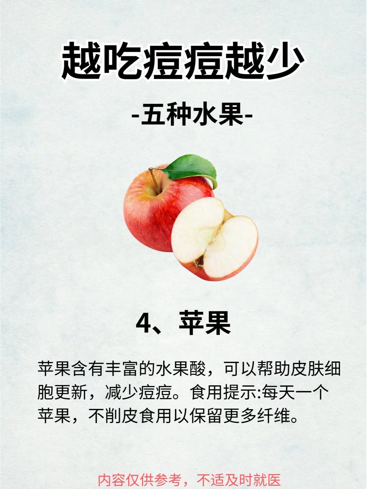 4、蘋果 蘋果含有豐富的水果酸,可以幫助皮膚細 胞更新,減少痘痘。食用提示:每天一個 蘋果,不削皮食用以保留更多纖維。