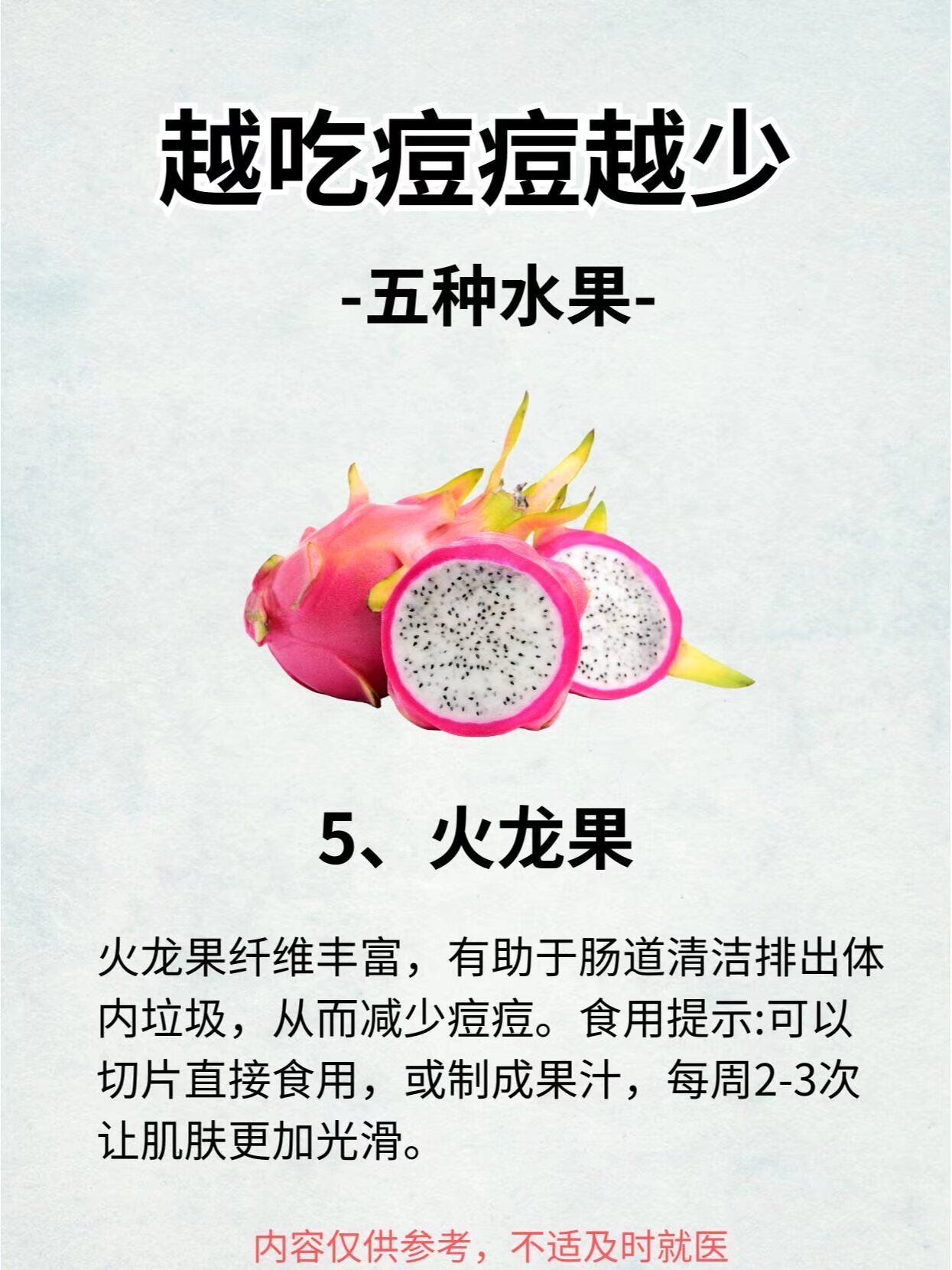 5、火龍果 火龍果纖維豐富,有助於腸道清潔排出體 內垃圾,從而減少痘痘。食用提示:可以 切片直接食用,或製成果汁,每週2-3次 讓肌膚更加光滑。