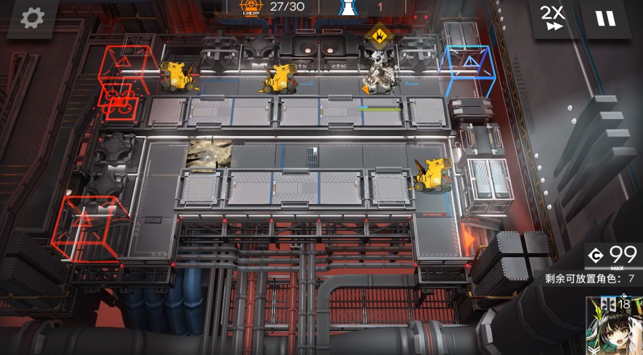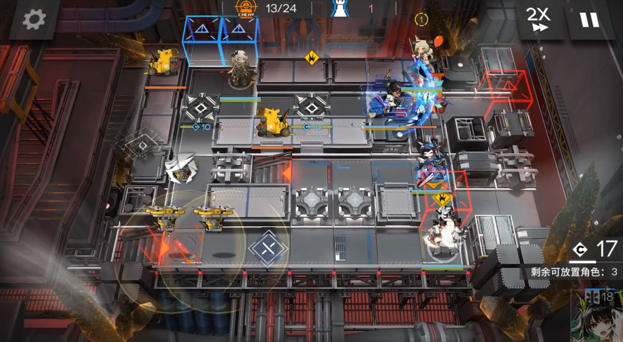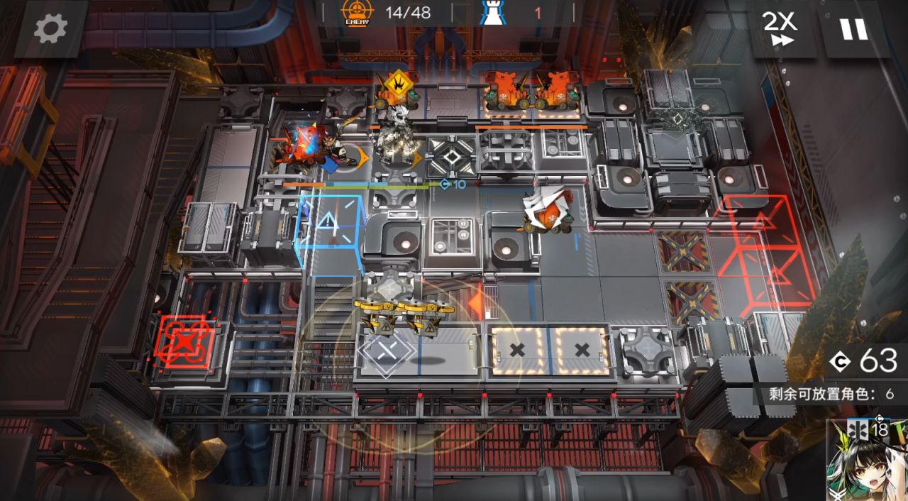 沙盤推演選1級左邊和2級左邊。用EW好打,開3次技能。依次部署先鋒(在左邊紅門往下4格的右邊1格),EW朝右,第一次技能好了就開。部署lgs朝左,夜鶯朝下,小羊朝左,夜鶯這邊醫療壓力大的可以放鳥籠,棘刺朝左,伊桑朝右。EW第二次開技能在23殺,左邊紅門出現黑色球的怪再開(大概下圖時間),第三次好了就開,結束。