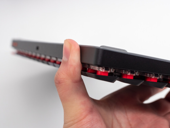 這把鍵盤在頂部最厚的地方也只有21.5mm,這差不多就是從你大拇指之間到第一個指關節之間的的長度,考慮軸體壓縮空間的話,這把鍵盤在包裏最多需要17.5mm就夠了。