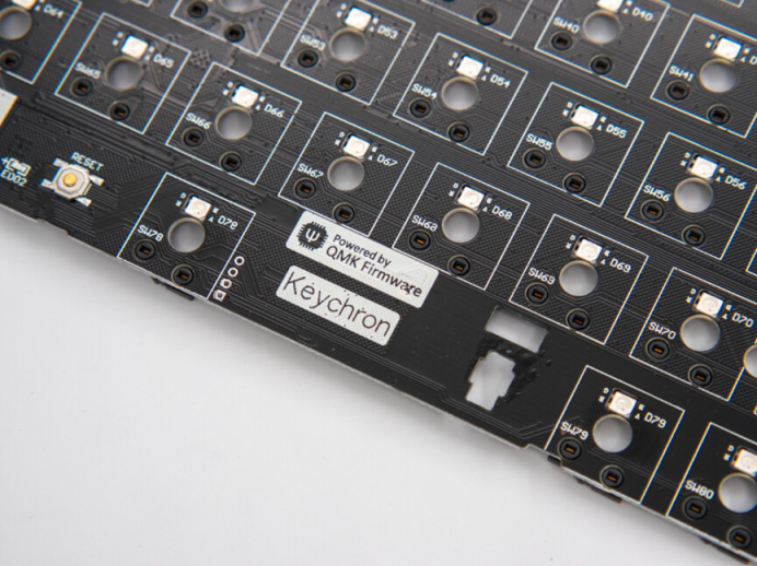 在PCB板在可以看到產品型號和keychron以及QMK的LOGO。