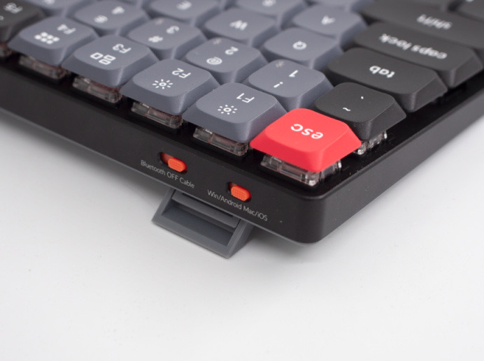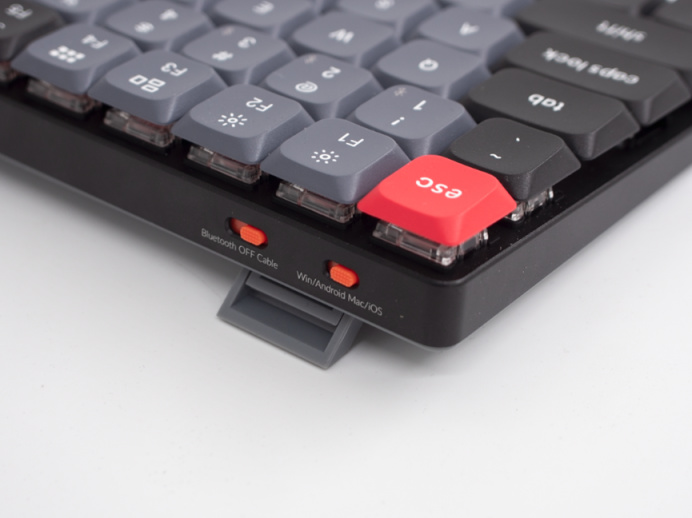 正常的三模鍵盤三段式開關是藍牙\2.4G\有線,而keychron的則是藍牙\關閉\有線。中間的關閉檔位在產品設計上來說有些多餘了。