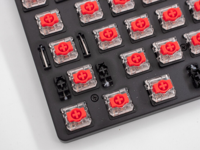 最右邊的是一顆來自意法半導體的STM32L4 MCU作爲鍵盤主控,ARM Cortex-M4,配有128Kb ROM。