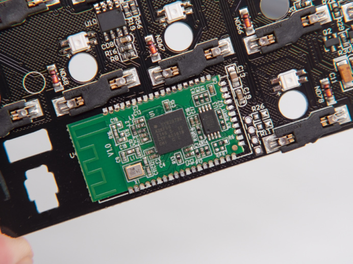 無線IC集成在單獨的小板上,並有獨立的天線設計,這和大廠鍵盤的無線設計非常類似,也要比大部分的國產鍵盤的無線設計好得多。
