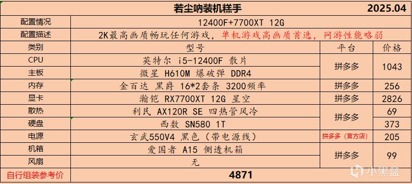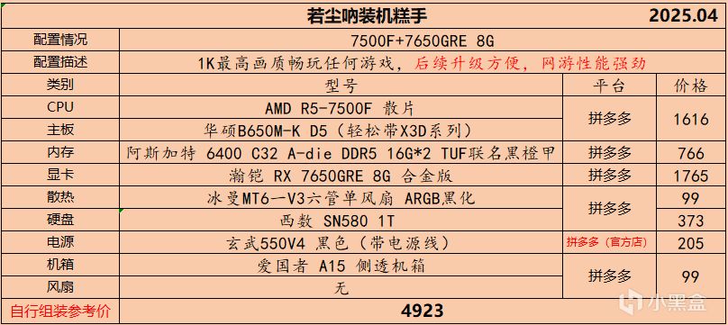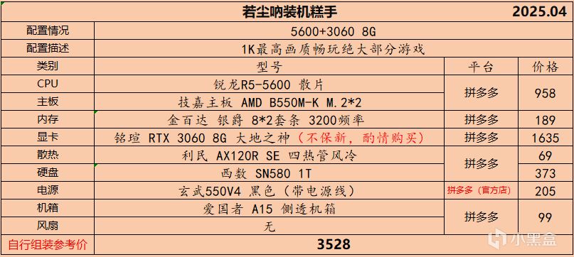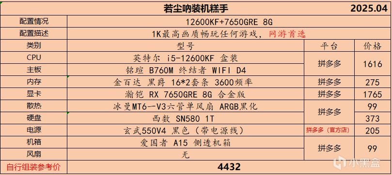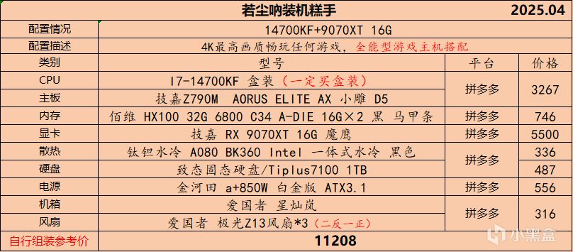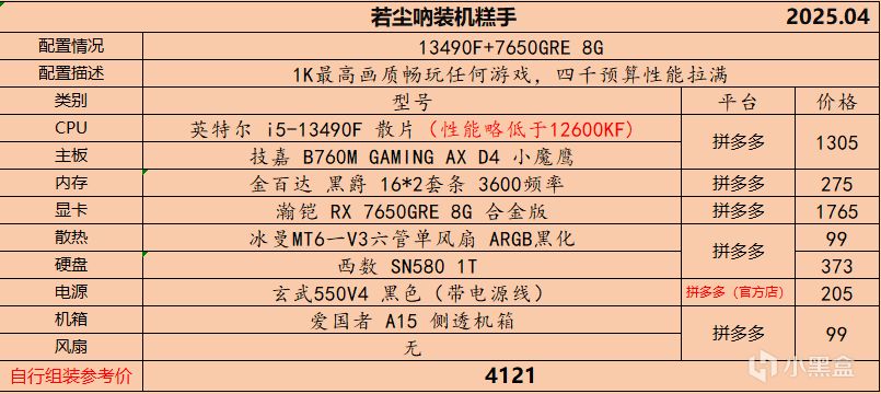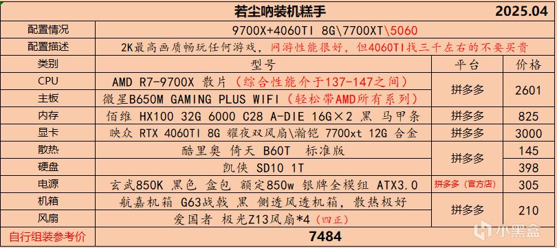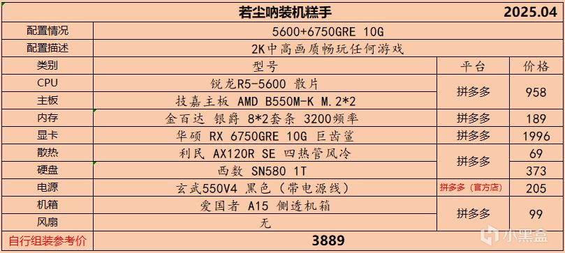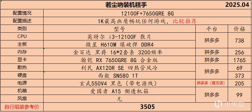 三、3000-4000預算,這個預算可以正常搭配出性能較爲出衆的1K暢玩遊戲主機了,所有配件給的也不是很緊張不需要過於壓預算,當然,AMD顯卡仍舊上大分,下面給出三種搭配共盒友參考: