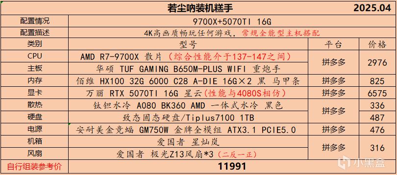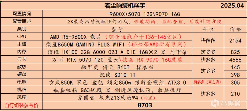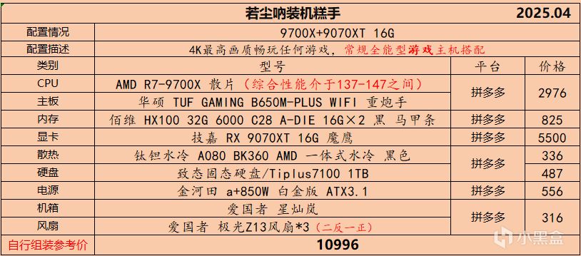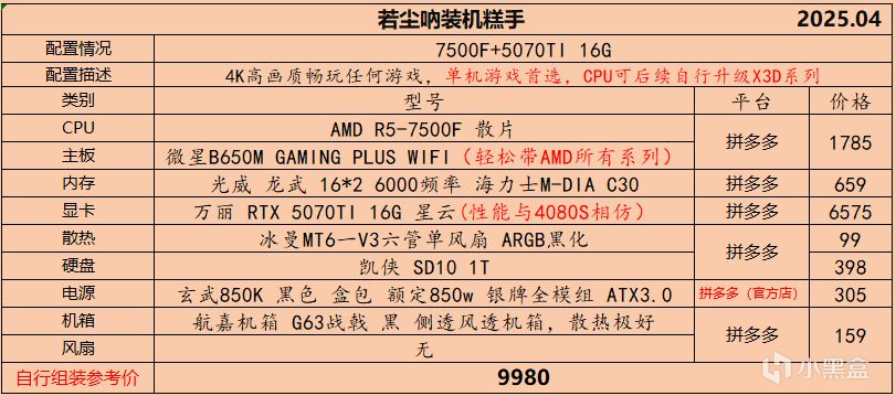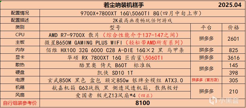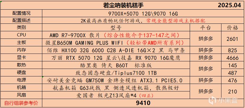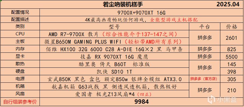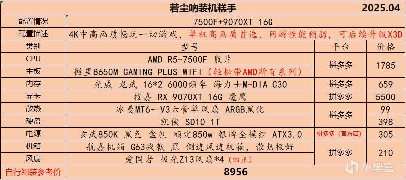 八、8000-9000預算,這個預算選擇空間比較小,基本是上一個預算的補充,但勉強可以搭配9070XT,可以4K暢玩所有遊戲了,正常購買大概需要九千出頭: