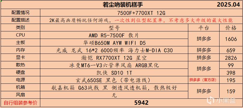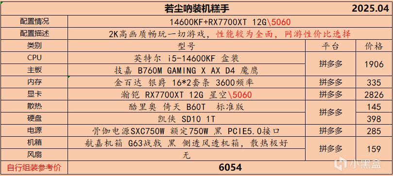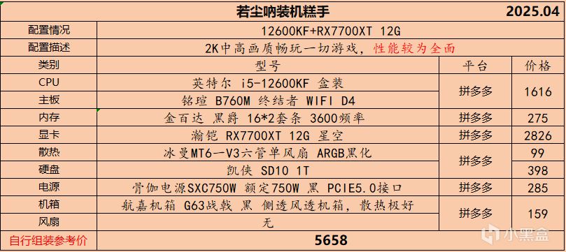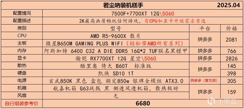 五、5000-6000預算,推薦的不多,主要是現在N卡沒有任何選擇,所以不做過多推薦, 顯卡以7700XT(性能好於4060TI)爲主推薦二個配置單: