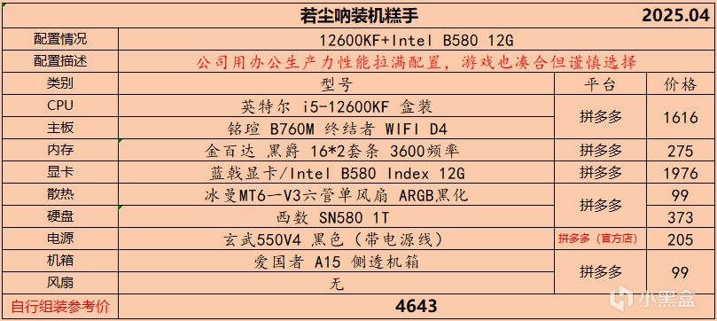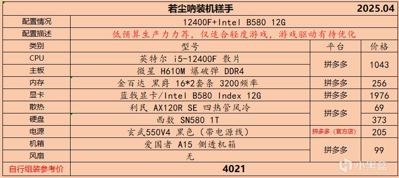 四、4000-5000預算,這個預算目前盒友需求還是挺多的,之前寫的都不多,這一次幫你們把幾乎所有使用場景的搭配都給寫出來,包括使用英特爾顯卡進行生產力需要,本次推薦六個搭配,需要的盒友按需裝機: