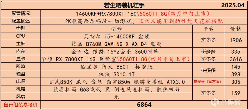 六、6000-7000預算,這個預算仍然是AMD顯卡的主場,N卡僅供四月中下旬上市後參考,當然,CPU這邊英特爾14600KF仍舊是性價比首選,本次給到四個搭配,其中三個是性能拉滿配置,另一個則是後續大幅度升級的首選,都有備註,盒友按需裝機: