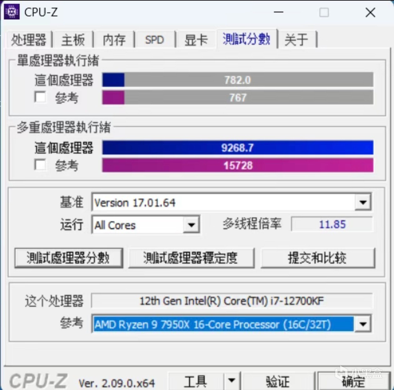 CPU跑分如下图所示,与本人的i7-14600KF并无明显差距,单核14600KF默频状态下为853分,多核和12700KF一样接近10000分。
