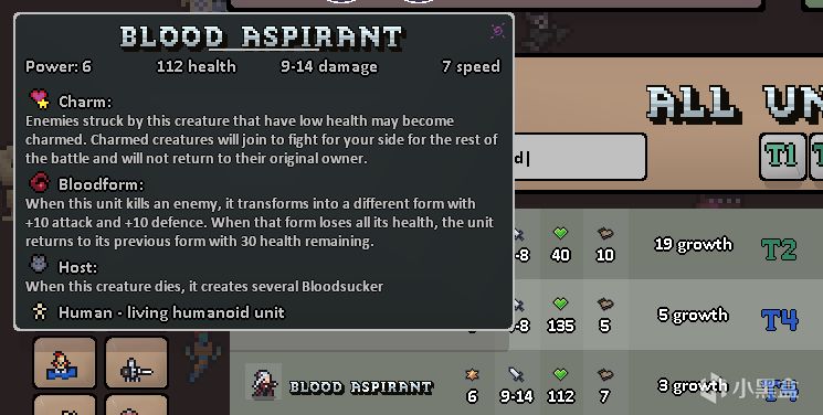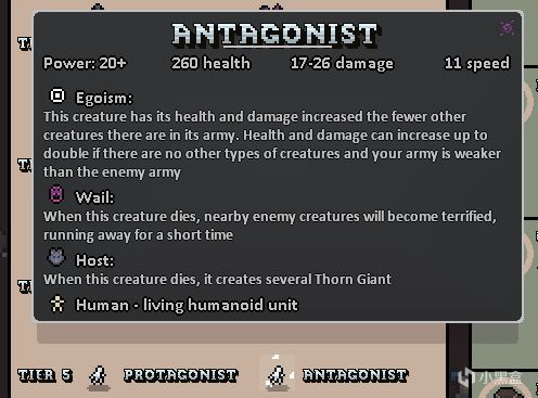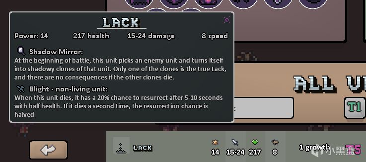 作爲四級兵營的單位能擁有魅惑詞條是很難得的,本身還擁有血形態詞條,殺死一個單位給自己疊攻防(即血量/傷害),該形態下血量見底時還會變成30血的原形態,相當於還能再撐一會兒。總的來說是個可靠的前排。我這裏點出毀滅是爲了配合宿主詞條,通過反覆自爆打輸出。
