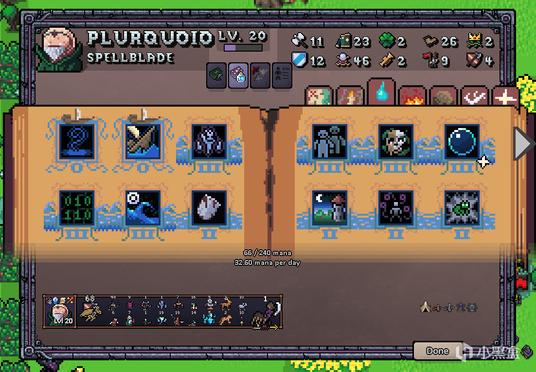 用圖上這點法術就差不多了,操作的細一點,那就按下面的順序:自家後排睡住(第二排第四個法術),給暗影放巨人軍隊(第一排第四個),再給前排套泡泡盾(第一排第六個),給對面放擾亂(第二排第三個),禁錮(第二排第五個),還有暗影施法(沒在圖中)。之後看着回聲技能把這些法術反覆排列組合,這足夠對面喝一壺的了。如果你想問這些法術的藍從哪來以及法術的效果如何,請看我這恢復術+緩衝的combo,這英雄本體240藍,46法強,32.6回藍的誇張數據,足夠你打消這些疑慮了。