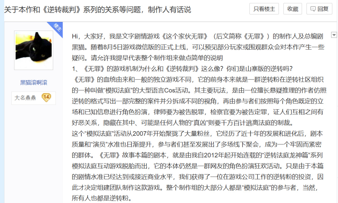 除了被質疑抄襲,《無罪之庭》還被認爲是“刻意碰瓷《逆轉裁判》來喫黑流量”。回應這個話題時,話龍向我分享了團隊裏的另一名製作人黑貓,一段在兩年前用來反駁這種說法的話:
