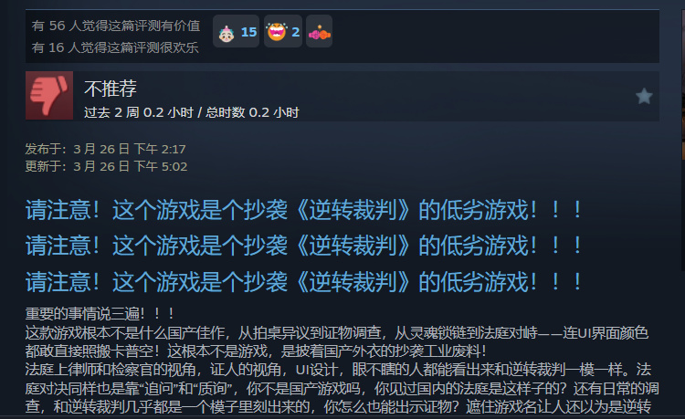 實際在《無罪之庭》發售一週後,遊戲在Steam上獲得了201篇評論,整體好評率爲91%。即便是差評,討論的也不是遊戲抄襲與否,而是對劇情上的一些邏輯Bug不夠滿意。