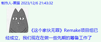 2023年,爲了滿足部分老粉絲“想看續作”的願望,同時也爲了能有更多玩家接觸到這部作品,黑貓創意工坊開啓了《這個傢伙無罪》的重製項目。身體抱恙的黑貓找來了他的摯友話龍,希望他能擔任製作人,讓團隊內部所有成員的白月光以新時代的技術力重獲新生。