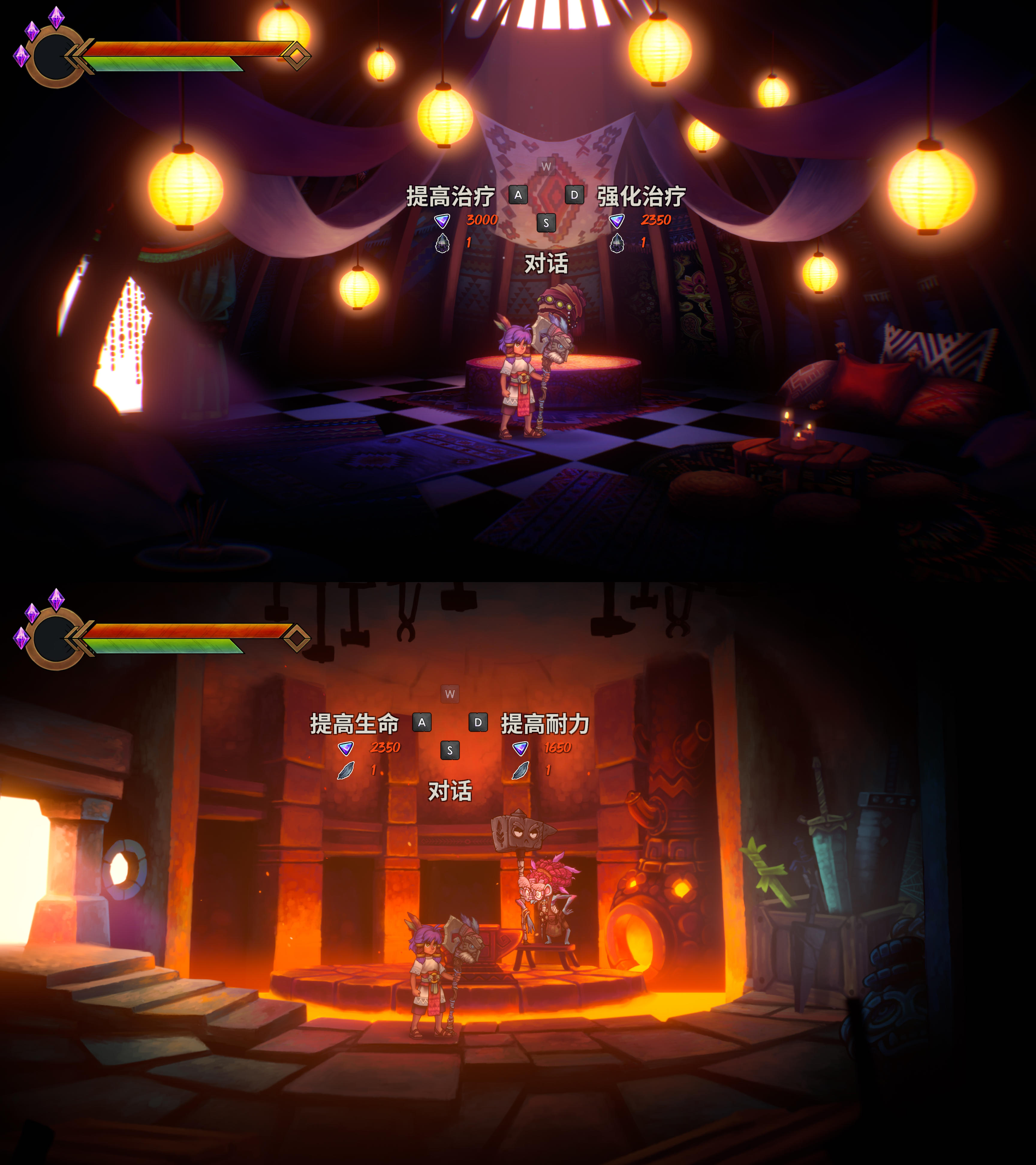 每完成一個區域的探險,就會回來一次大本營,玩家可以在接新任務的同時可以升級一下自己的HP和MP上限